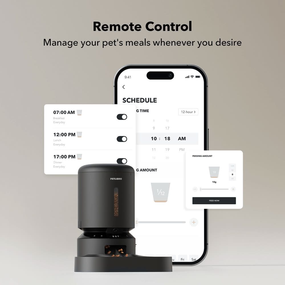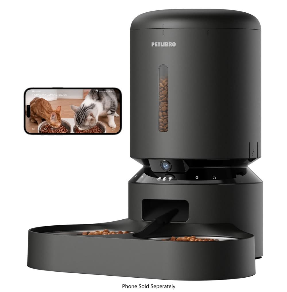 This PetLibro Automatic Dual Pet Feeder has a built-in 1080p HD camera with a 146° wide-angle lens and night vision helps you feel right at home with your pets during mealtimes. Pets love routine, which is why the mealtime call is crucial. The two-way voice system helps you reassure your pets with your voice and hear their happy woofs and meows. Once the motion detector senses movement, the camera records and saves videos of your pets' activities. You'll even get alerts on your phone so you can watch in real time. Plan meal portions, diets, and feeding times from anywhere, right from your phone using the easy-to-use PetLibro app. The patent rotor in the tank base, twist-lock lid, desiccant bag, and sealing strip work together to keep food fresh, while the infrared safety system shuts down the feeder if pesky paws are detected inside the dispenser. Additionally, the low food level reminder alerts you when it's time to refill the feeder. Color: Black