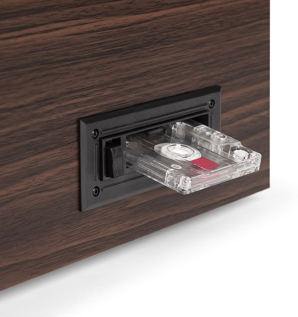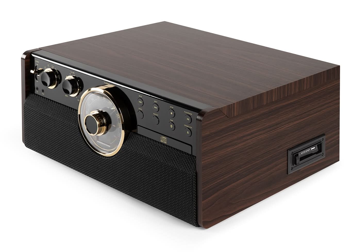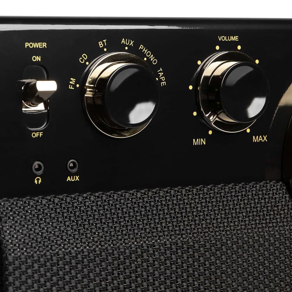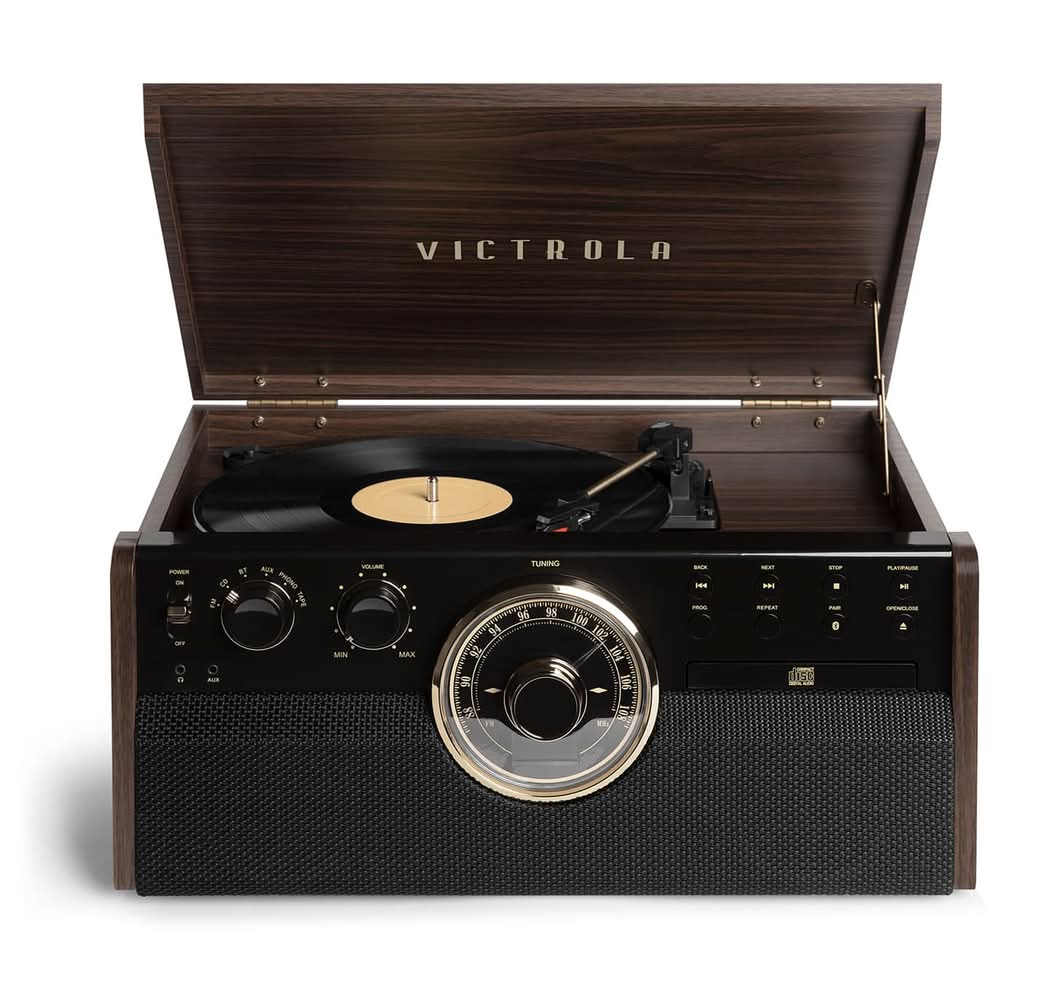 The Victrola Empire Signature 7-in-1 Bluetooth Record Player is perfect for vinyl lovers with its 3-Speed Turntable and Mid-century modern look. Stream your music via Bluetooth, or play your favorite tunes on the FM Radio, from the CD Player, or through the 3.5mm Auxiliary input! Features an analog radio dial with beautiful "around the dial" LED lighting and gold accents. Color: Gold/brown/black