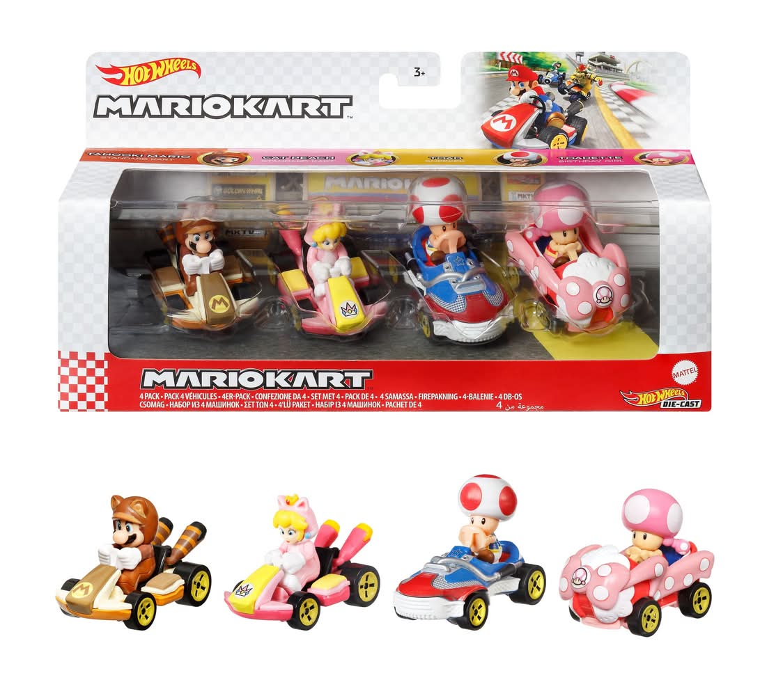 Kids can choose their favorite mix of Mario Kart character-inspired karts and speed off for racing and stunting madness with Hot Wheels Mario Kart 4-packs! Each features four 1:64 scale Mario Kart die-cast vehicles, including one exclusive vehicle. The fan-favorite character karts perform on Hot Wheels track to let kids power-up their imaginations by combining the thrill of Hot Wheels performance with the racing and thrills of Mario Kart! Color: Styles may vary
