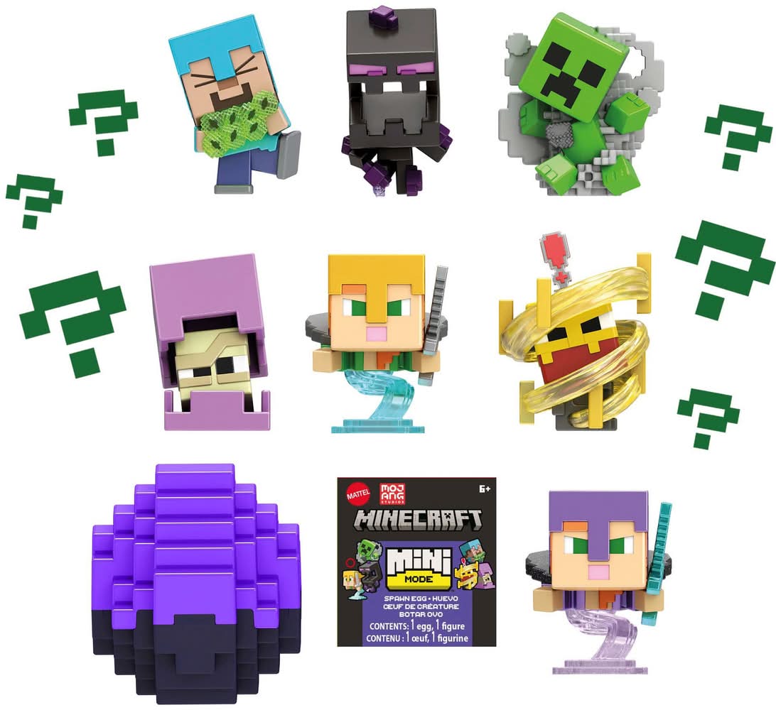 Capture the excitement of Minecraft with the Mini Mode Spawn Egg and figure collection. Inside each Spawn Egg is a 1.5-inch mini figure with an animated pose -- just open to discover which character is waiting within! The mini figure can be removed and placed back into the open capsule for play and display. The Spawn Eggs are themed with different biomes from the game to help set the environment, making them fun to collect. Color: Styles may vary