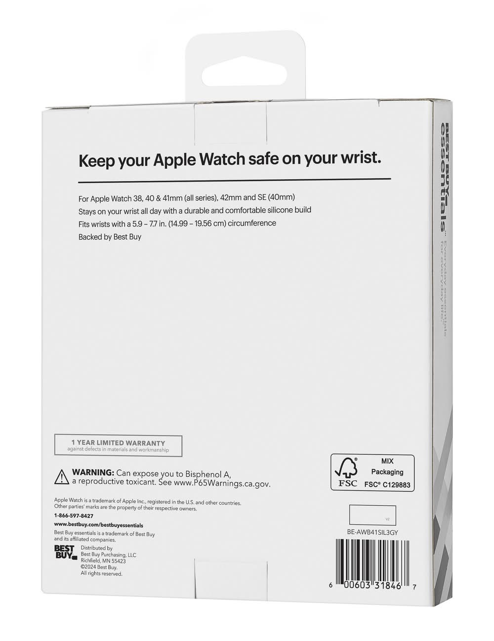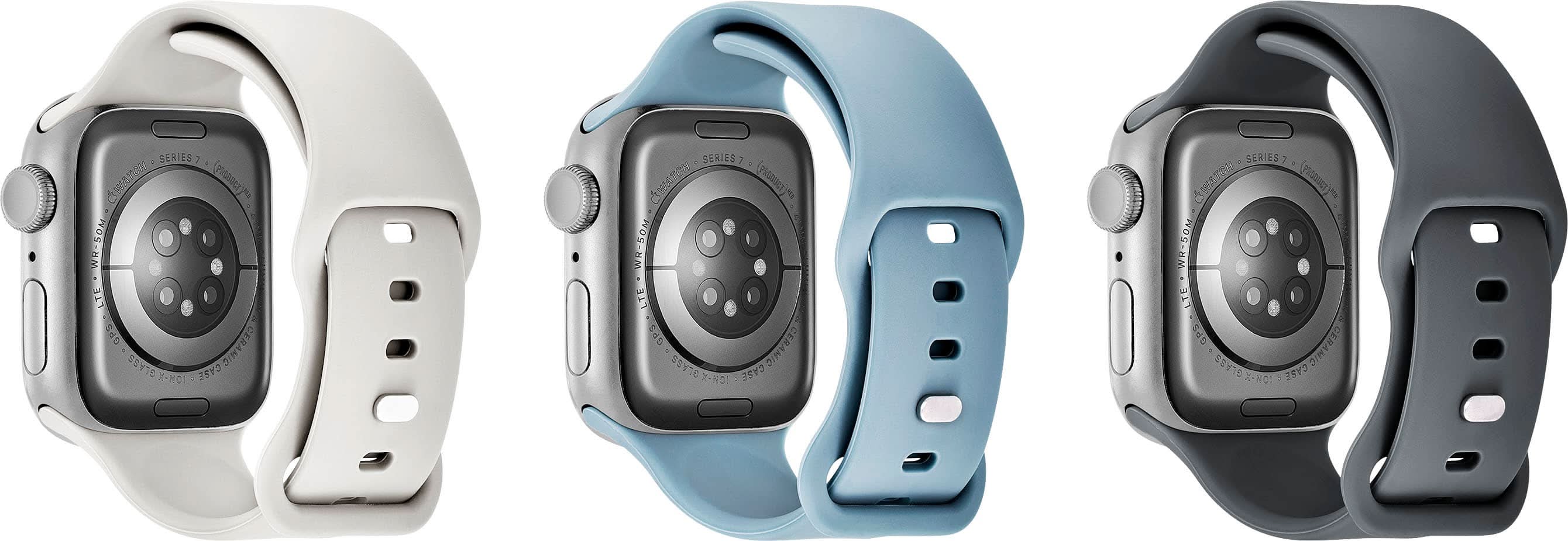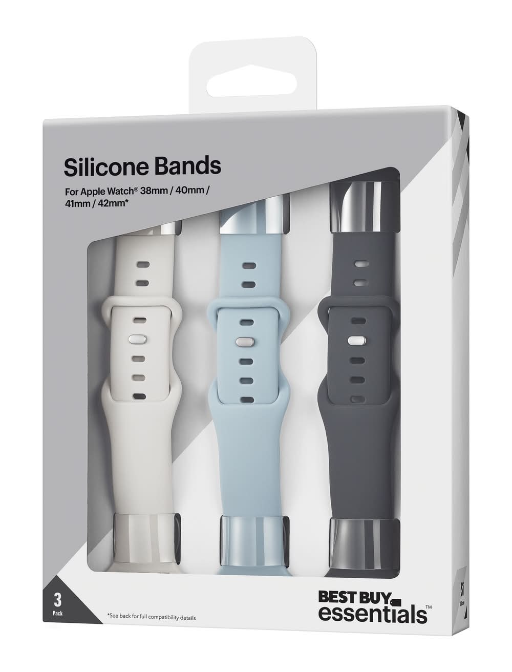 The Best Buy essentials Silicone Band for Apple Watch 38mm, 40mm, 41mm, 42mm (3-Pack) gives you three colorful bands to choose from. Their durable silicone design with sport pin stays firmly in place no matter the activity. Each band adjusts from 5.9 to 7.7 inches, ensuring a comfortable fit all day, every day. Color: Starlight, blue/gray and gray