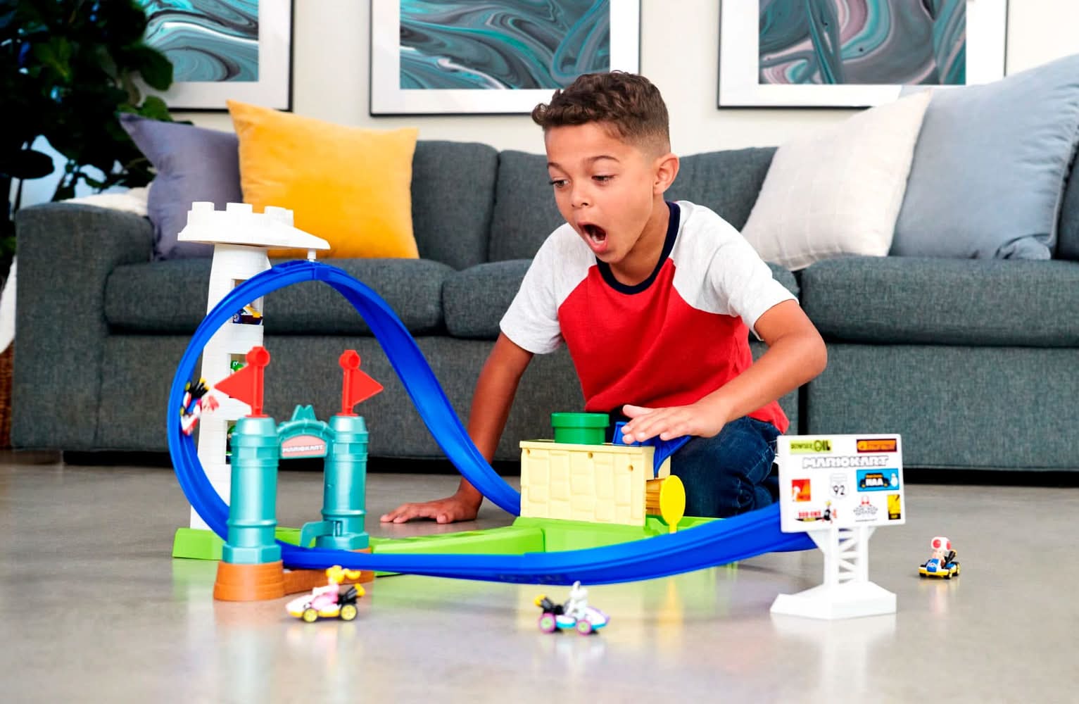 Hot Wheels brings the fast-paced action of the Mario Kart world to real life with a Circuit Lite Track inspired by iconic courses from the popular video game. Race kid-favorite Mario Kart character Mario as a die-cast kart vehicle and overcome obstacles and challenges—just like in the game, but this time on Hot Wheels track!