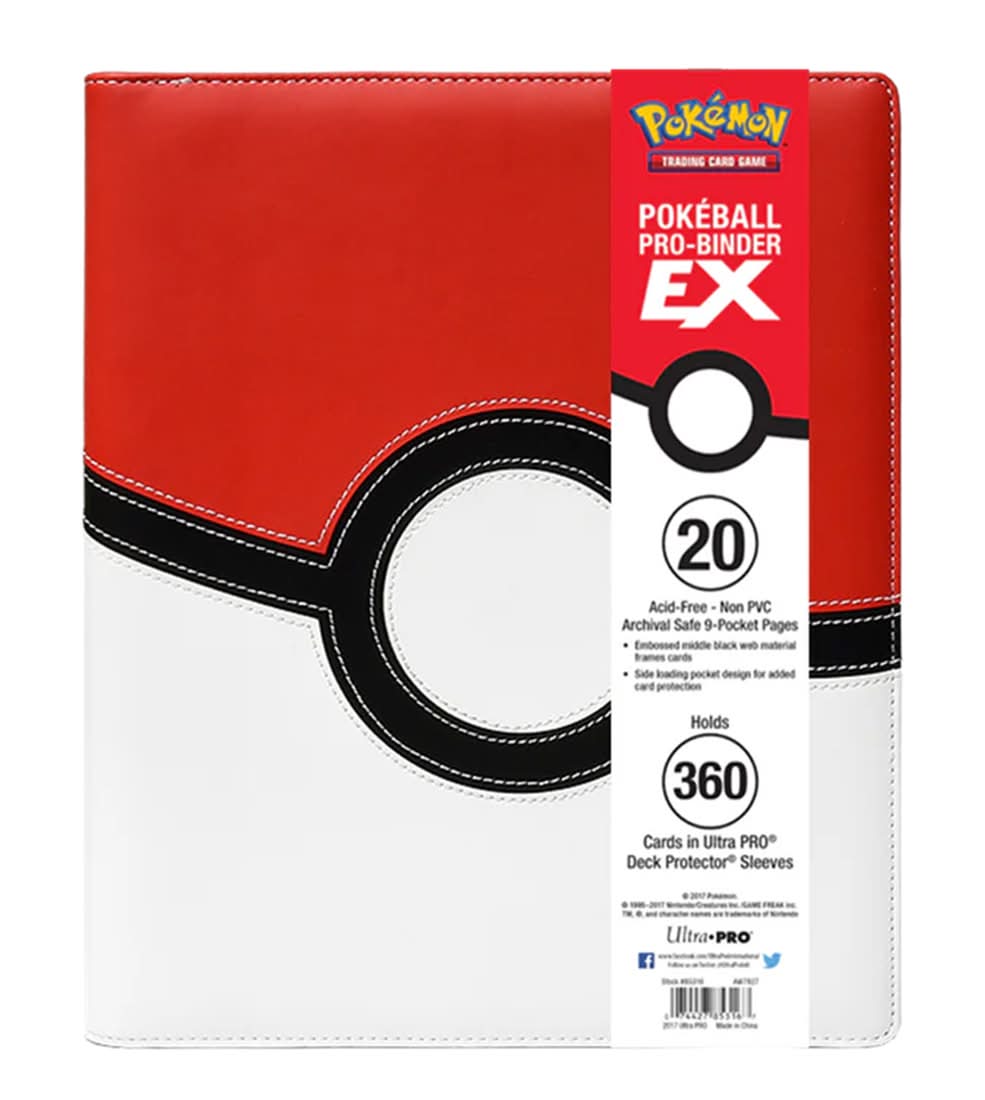 Premium 9-pocket PRO-Binder with debossed Pokémon logo and stitched iconic Poké Ball artwork. The cover is designed with a padded leatherette look. Black web material gives cards a classic framed look and is embossed for easy slide-in of cards. Sideloading pocket design to prevent cards from easily falling out. Elastic strap holds the binder shut when not in use. All materials are made from archival-safe, acid-free non-PVC material. Holds 360 cards in Ultra Pro Deck Protector sleeves. (Cards not included)