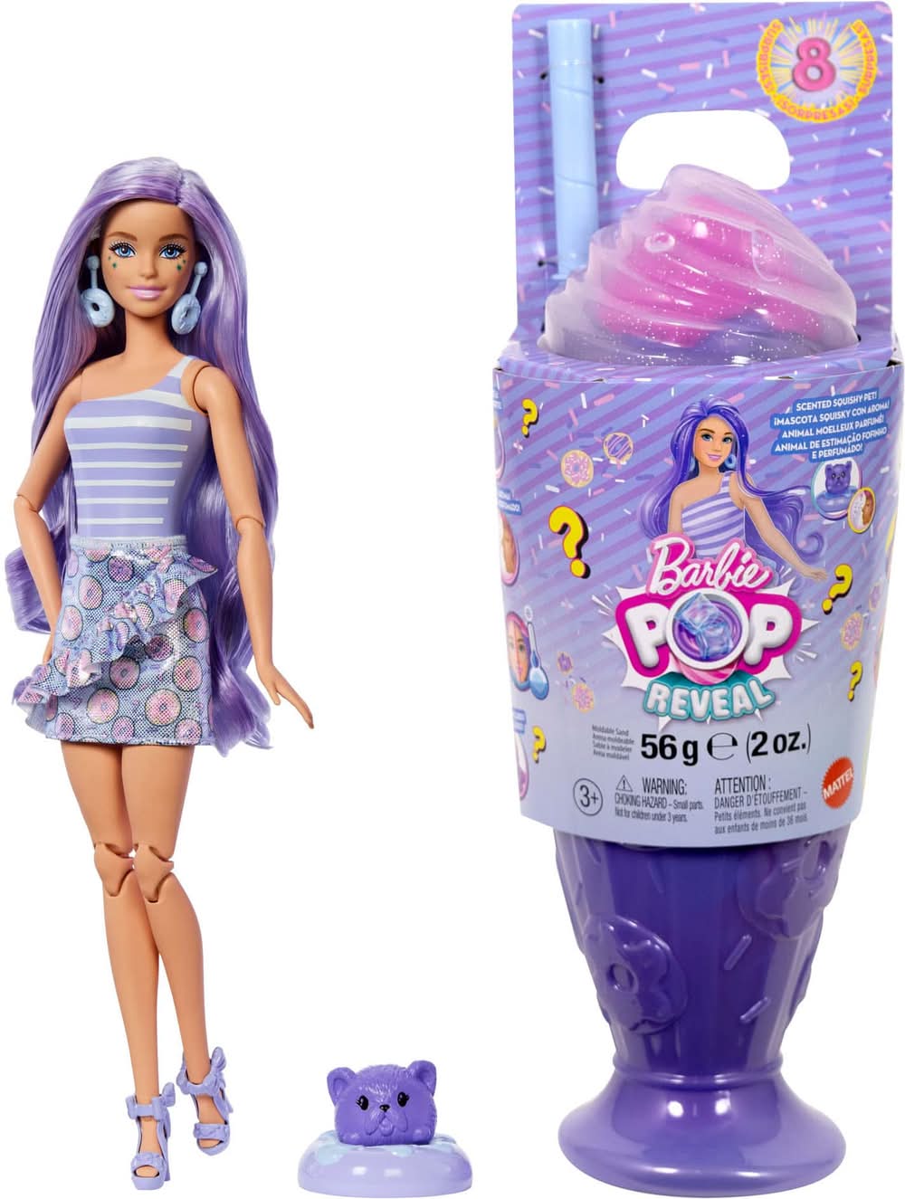 Barbie Pop Reveal Treat Series doll, Donut Dreams theme, offer a sensory experience with eight surprises to discover inside a sweets-inspired cup! Unscrew the whipped topping lid to find moldable sand and poke through the film with the straw for squishy fun. Peel the film on the cup to reveal a sweet-scented Barbie doll and six more surprises! Continue opening to discover two reusable ice cubes that pop open to reveal themed earrings and a pair of shoes or boots. Mystery bags reveal a colorful skirt, a squishy scented pet and a matching pet bed. Discover more wow with a color-change transformation on Barbie doll's face!