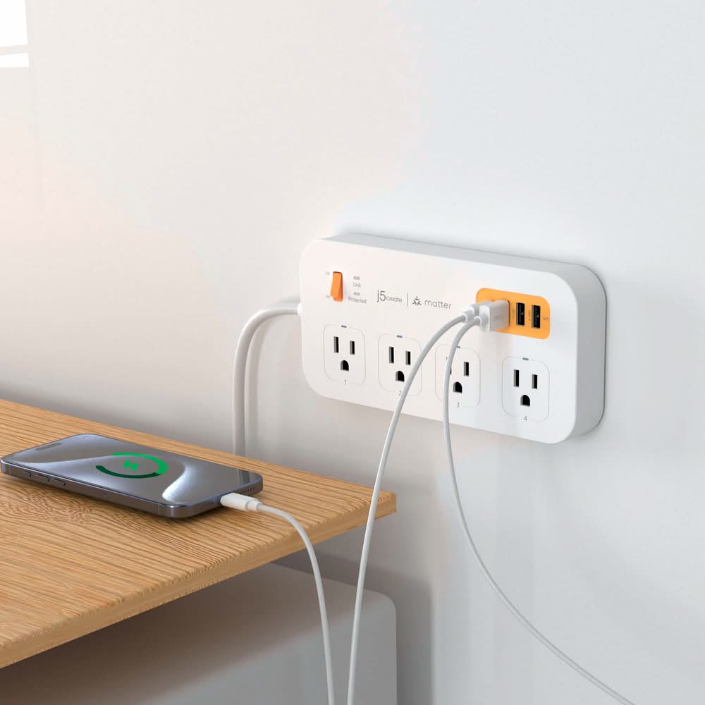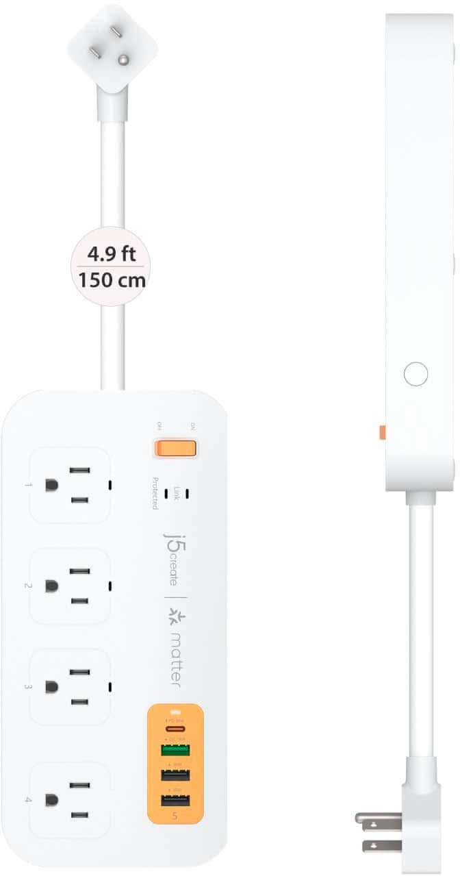 j5create - 4-Outlet/3-USB-A/1-USB-C 500J Smart Matter Enabled Surge Protector Power Strip - White & Orange