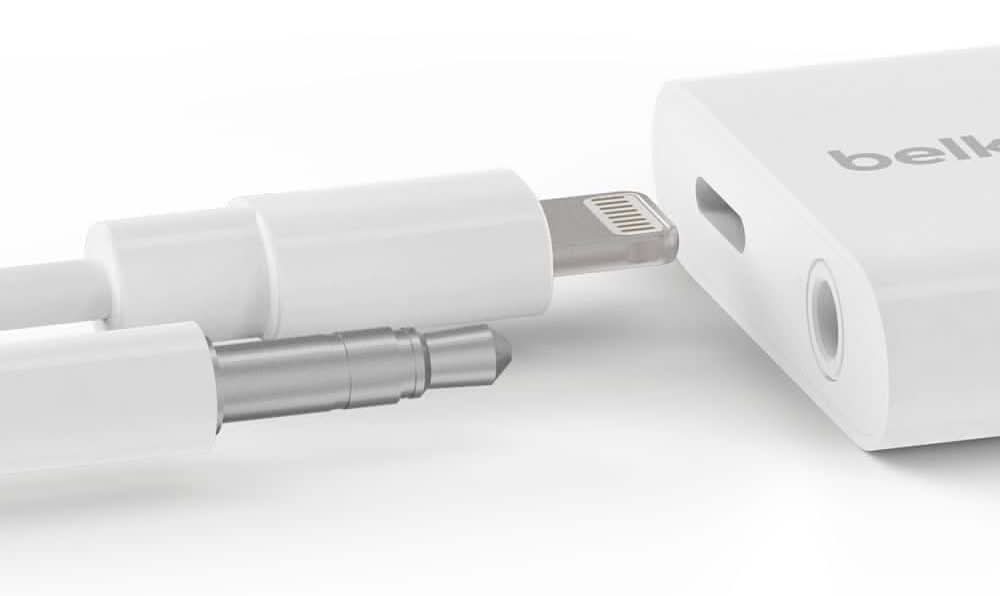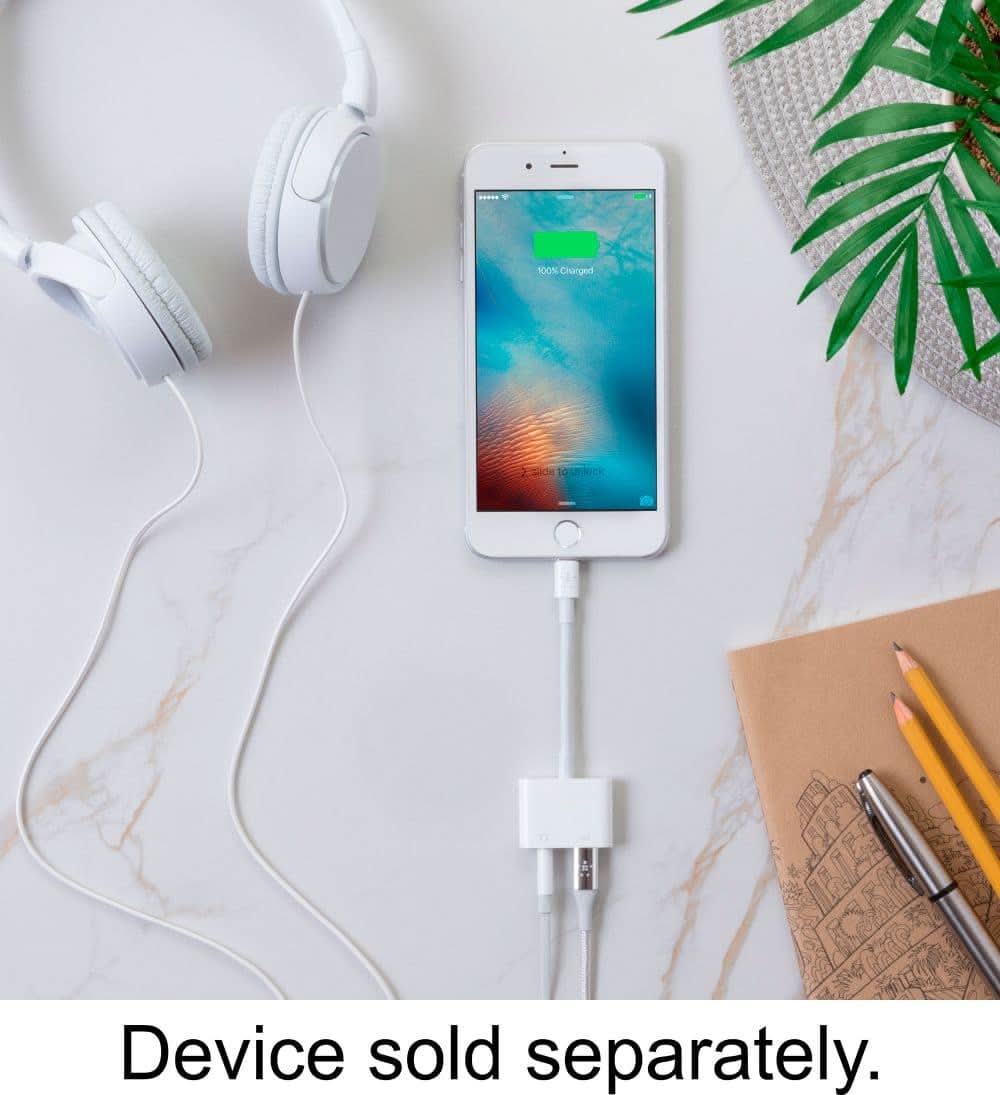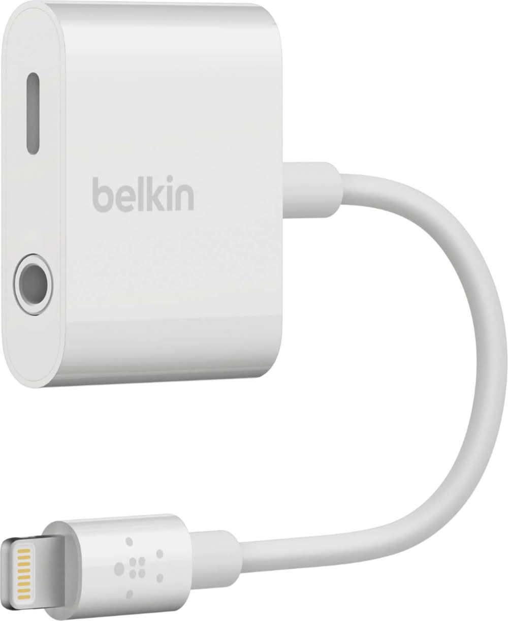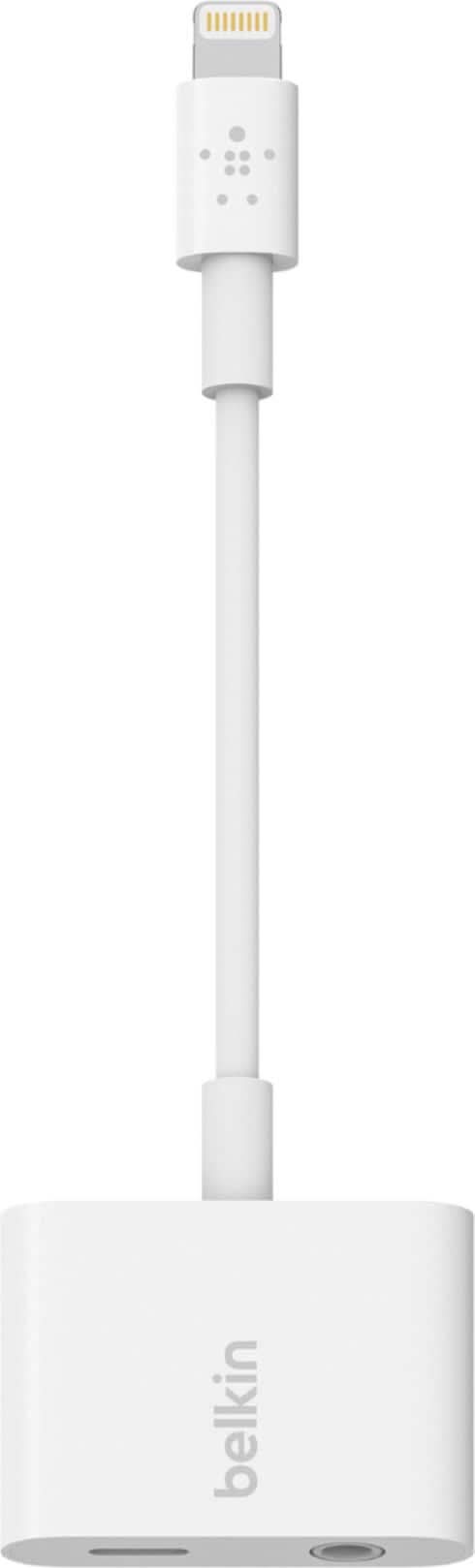 Plug both a charger and headphones into your iPhone with this Belkin Audio + RockStar adapter. Its 3.5mm aux port lets you connect an MFi-certified audio device, and its 2.4-amp Lightning port also supports data syncing for file transfers. The built-in digital-to-analog converter of this Belkin Audio + RockStar adapter maintains the original sound quality of your music. Color: White