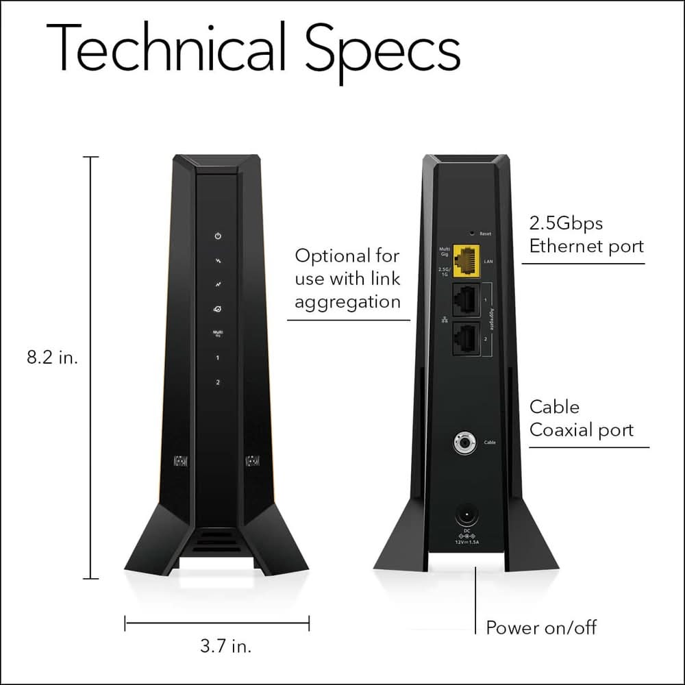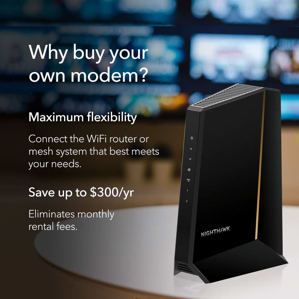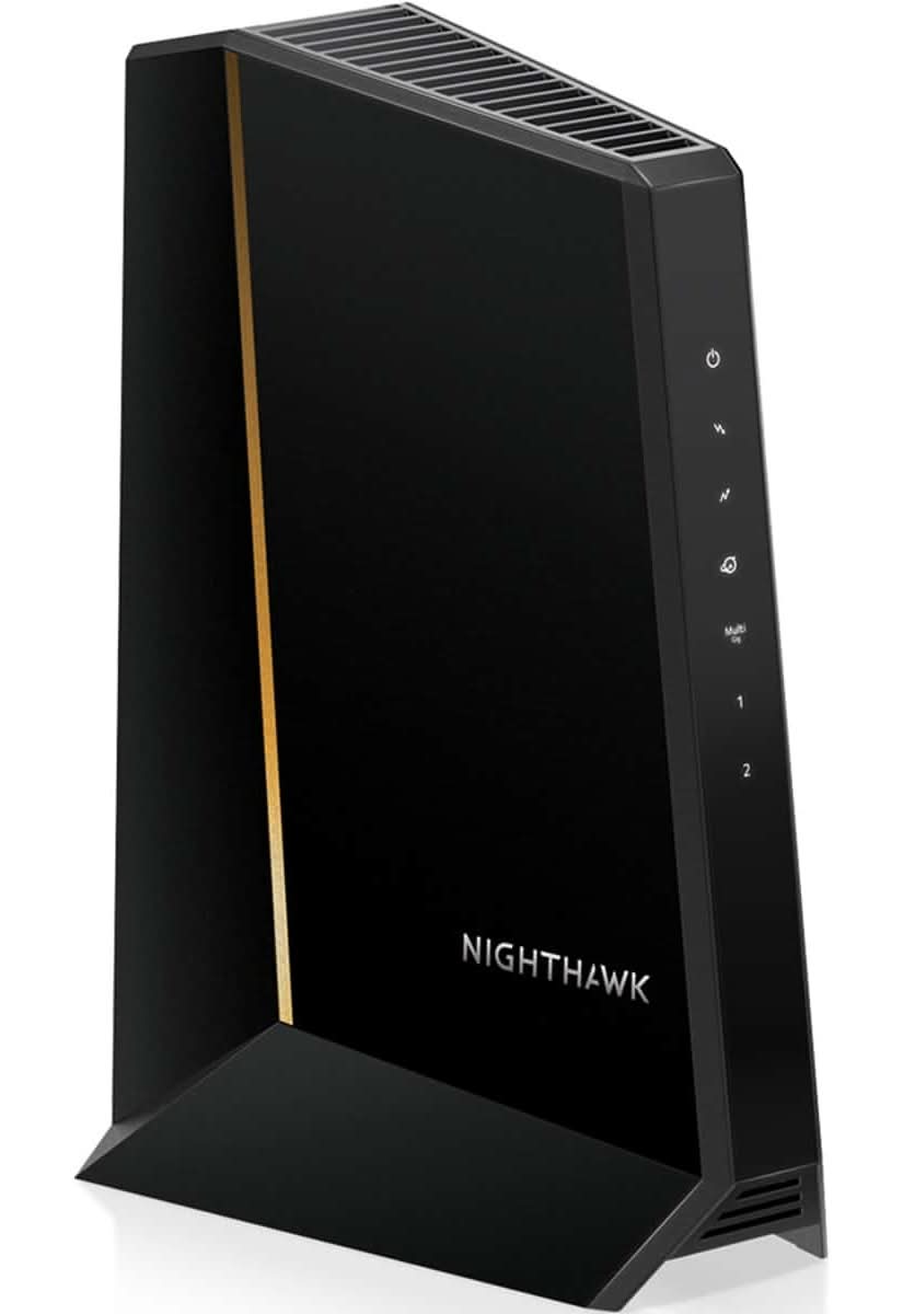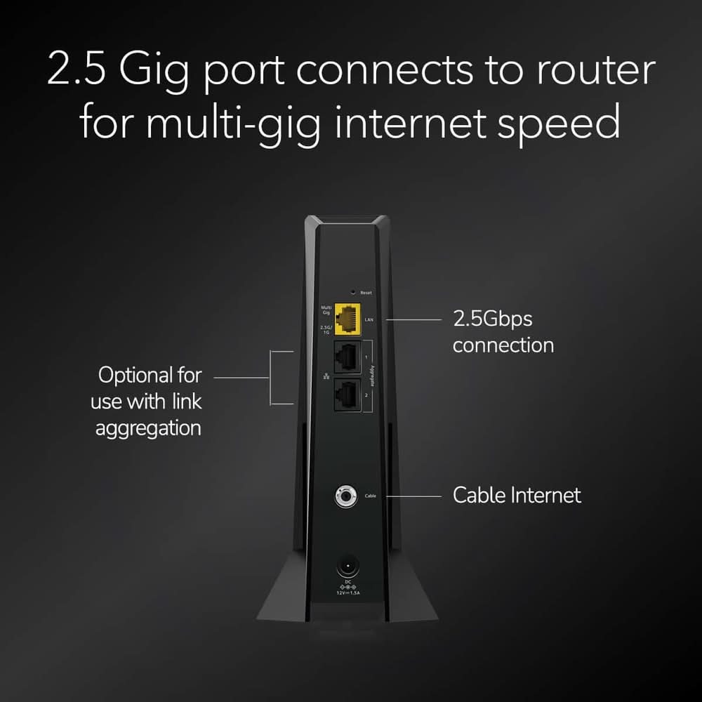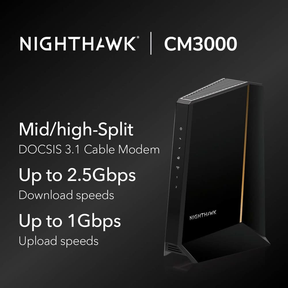The Nighthawk CM3000 multi-gigabit speed cable modem by NETGEAR supports link aggregation to deliver true multi-gigabit Internet speeds. The future-proof cable modem supports fast Internet speeds. This DOCSIS 3.1 cable modem is ready for any of today's service plans and future upgrades. Take a big leap forward with the next-generation Nighthawk CM3000 DOCSIS 3.1 high-speed cable modem with mid/high-split technology, specifically engineered to handle fast cable Internet speeds. With upload speeds up to 1Gbps and 2.5Gbps download speeds, your entire family can enjoy 10 times faster upload and download speeds for lag-free gaming, crisp videoconferencing, smoother music and video streaming, and instant app downloads over DOCSIS 3.0.2. To push your performance even further, simply pair it with a NETGEAR Wi-Fi 7 router or Orbi system (sold separately). The Nighthawk CM3000 works seamlessly with most major US cable service providers, easily supporting 2Gbps home Internet speeds and even up to 200 Mbps upload speeds delivered by Xfinity. Color: Black