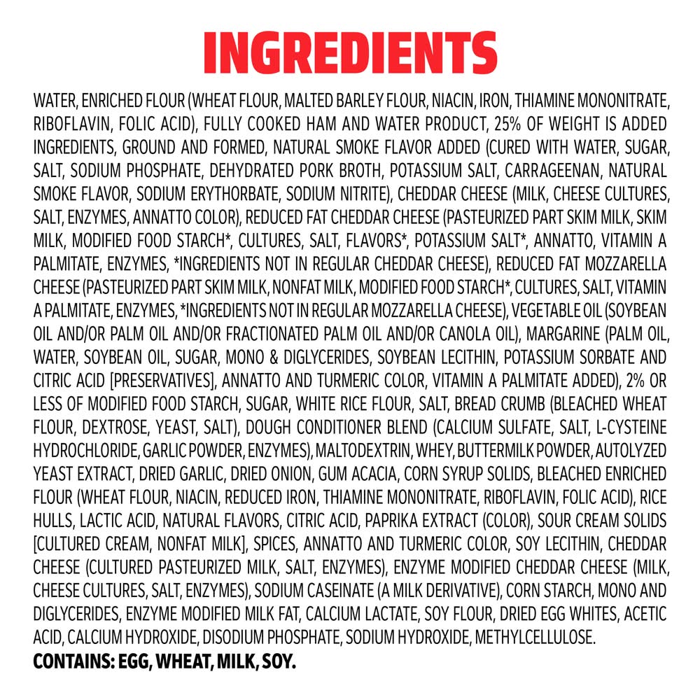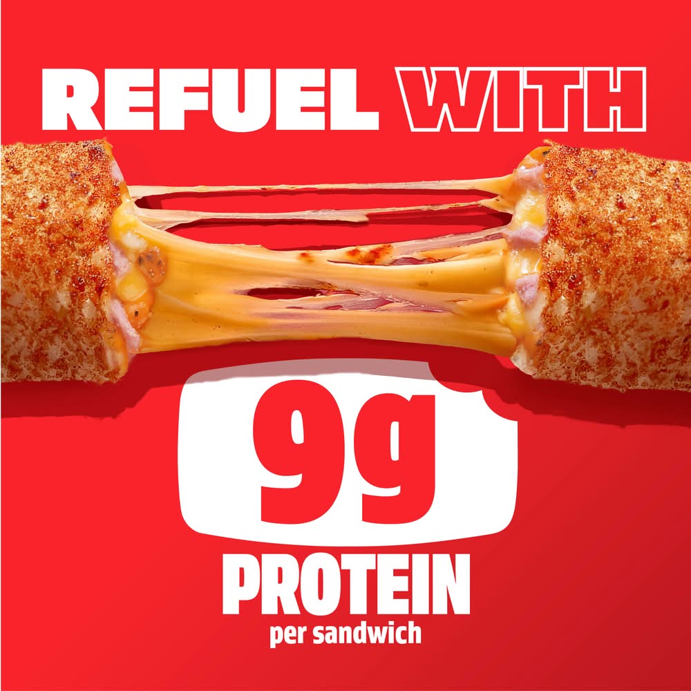 Dive into the cheesy, saucy and savory world of snacking with Ham and Cheese, Extra Cheese. This box comes with frozen sandwiches, so you can share with friends and family or save some for later. Each sandwich is loaded with ham, reduced fat mozzarella and cheddar cheeses, sauce, and stuffed inside a flavor blasted crust. These indulgent ham and cheese snacks aren’t your average frozen lunch snacks. These sandwiches are hunger’s worst nightmare, delivering the bold flavors of ham and cheese in a hearty microwaveable snack. Great for gaming all night, a convenient breakfast sandwich or a quick snack before heading out the door – a Ham and Cheese sandwich is perfect for any occasion. • Flavor: Ham-cheddar • Packaging: Reusable