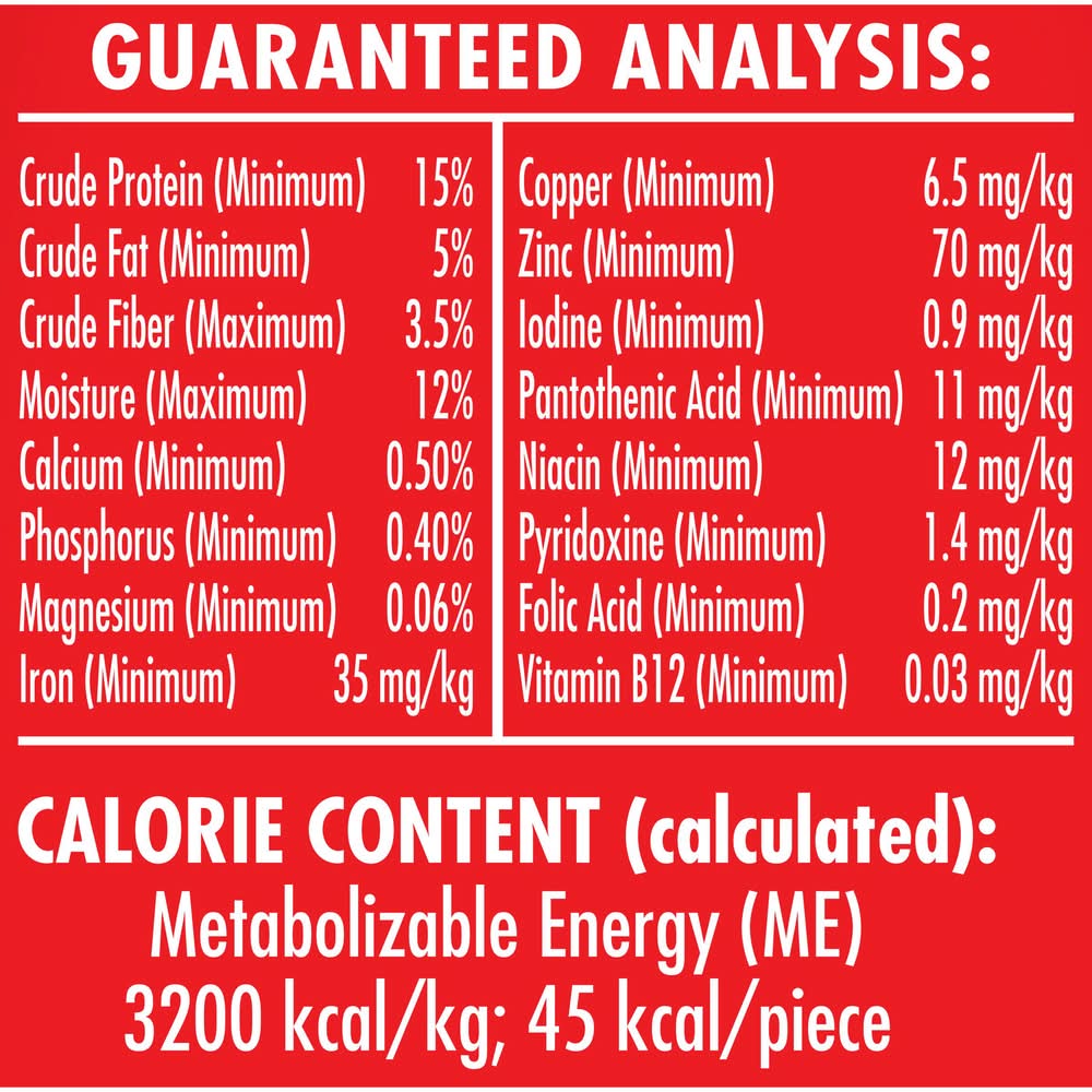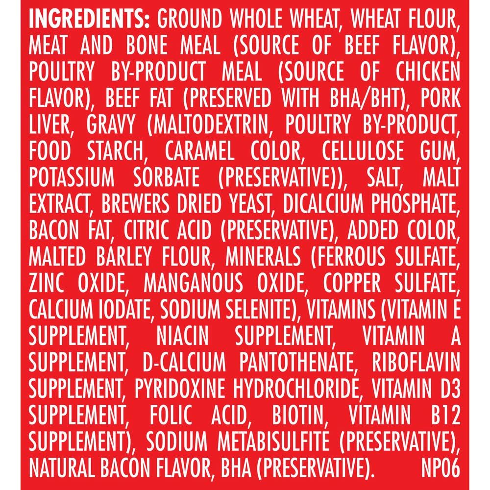 Ingredients: Ground Whole Wheat, Wheat Flour, Meat And Bone Meal (Source Of Beef Flavor), Poultry By-Product Meal (Source Of Chicken Flavor), Beef Fat (Preserved With Bha/BHT), Pork Liver, Gravy (Maltodextrin, Poultry By-Product, Food Starch, Caramel Color, Cellulose Gum, Potassium Sorbate (Preservative)), Salt, Malt Extract, Brewers Dried Yeast, Dicalcium Phosphate, Bacon Fat, Citric Acid (Preservative), Added Color, Malted Barley Flour, Minerals (Ferrous Sulfate, Zinc Oxide, Manganous Oxide, Copper Sulfate, Calcium Iodate, Sodium Selenite), Vitamins (Vitamin E Supplement, Niacin Supplement, Vitamin A Supplement, D-Calcium Pantothenate, Riboflavin Supplement, Pyridoxine Hydrochloride, Vitamin D3 Supplement, Folic Acid, Biotin, Vitamin B12 Supplement), Sodium Metabisulfite (Preservative), Natural Bacon Flavor, Bha (Preservative) Contains: Wheat, Barley, Sulfites