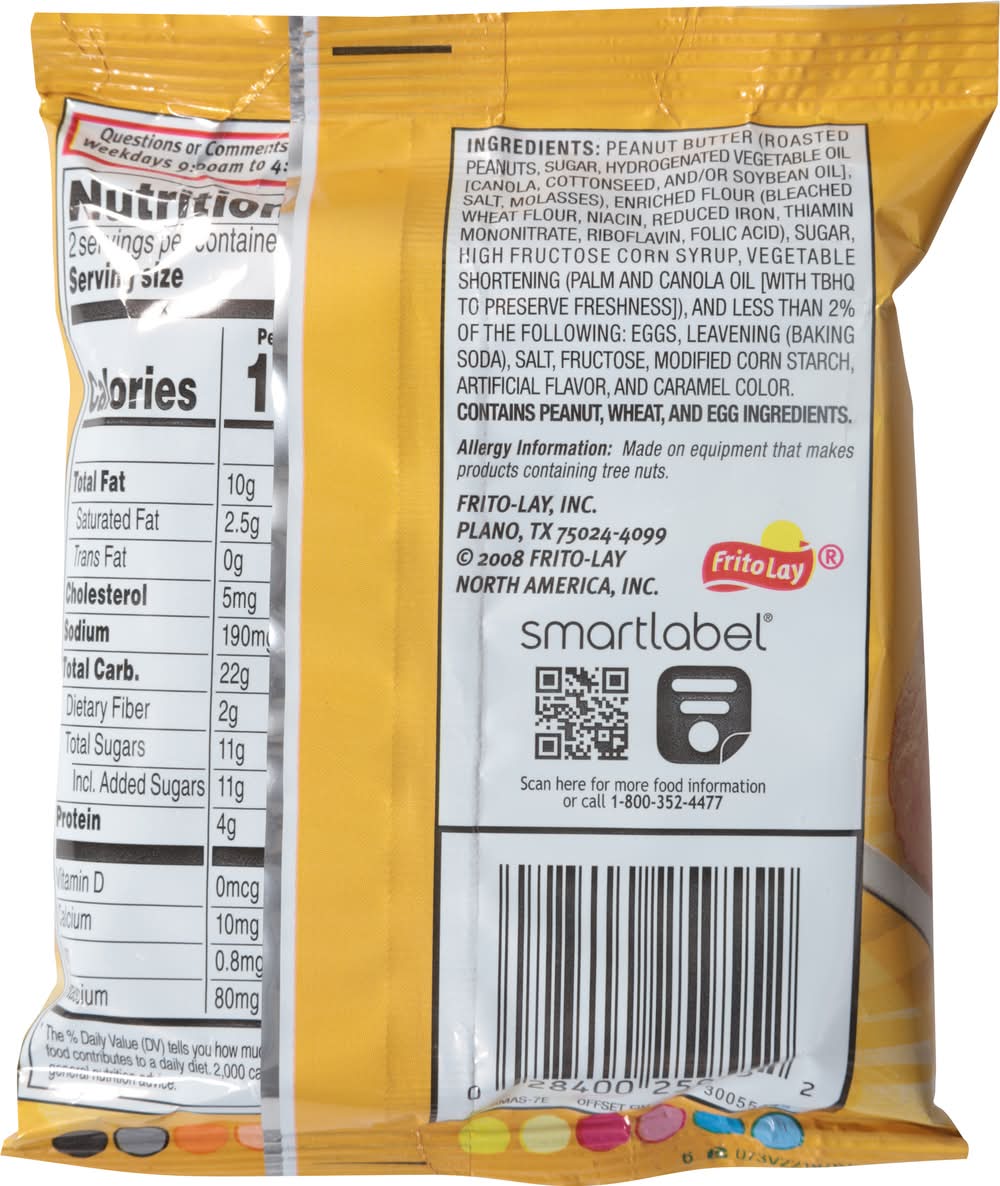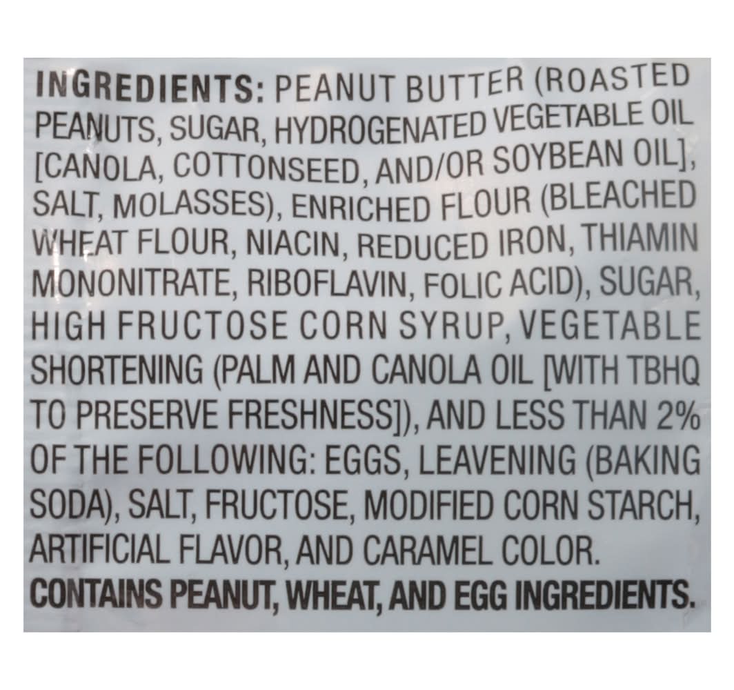 Ingredients: Peanut Butter (Roasted Peanuts, Sugar, Hydrogenated Vegetable Oil [Canola, Cottonseed, and/or Soybean Oil], Salt, Molasses), Enriched Flour (Bleached Wheat Flour, Niacin, Reduced Iron, Thiamin Mononitrate, Riboflavin, Folic Acid), Sugar, High Fructose Corn Syrup, Vegetable Shortening (Palm and Canola Oil [with TBHQ to Preserve Freshness]), and Less than 2% of the Following: Eggs, Leavening (Baking Soda), Salt, Fructose, Modified Corn Starch, Artificial Flavor, and Caramel Color Contains: Peanuts, Wheat, Eggs, Soybeans, Tree Nuts