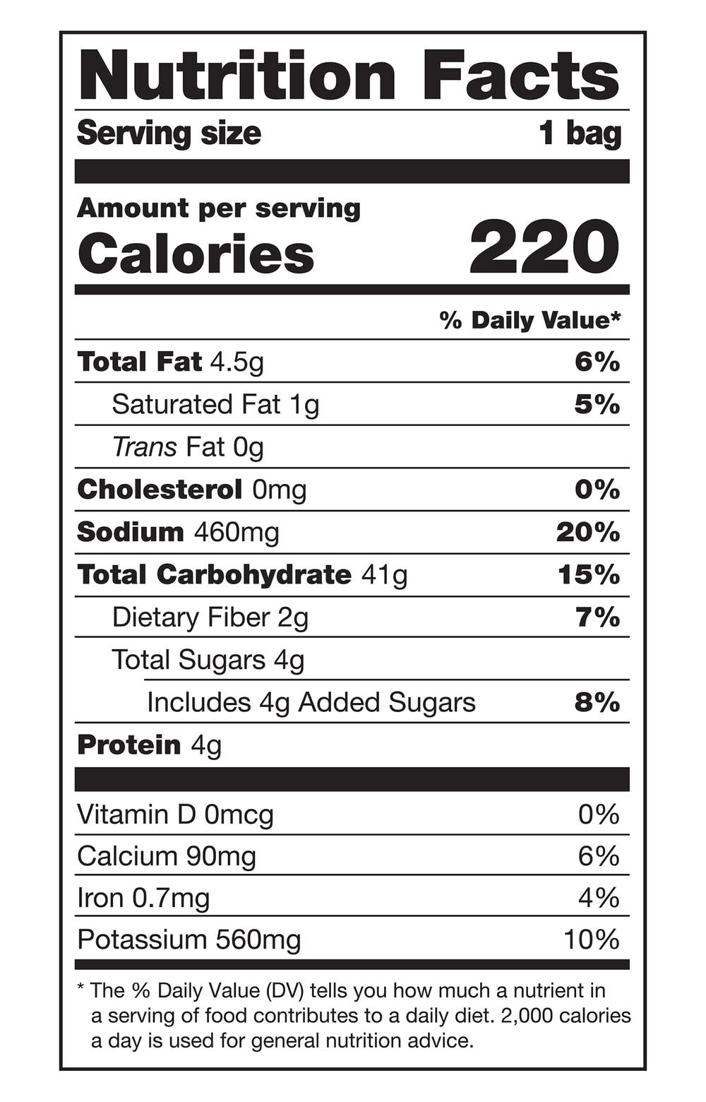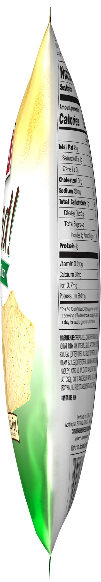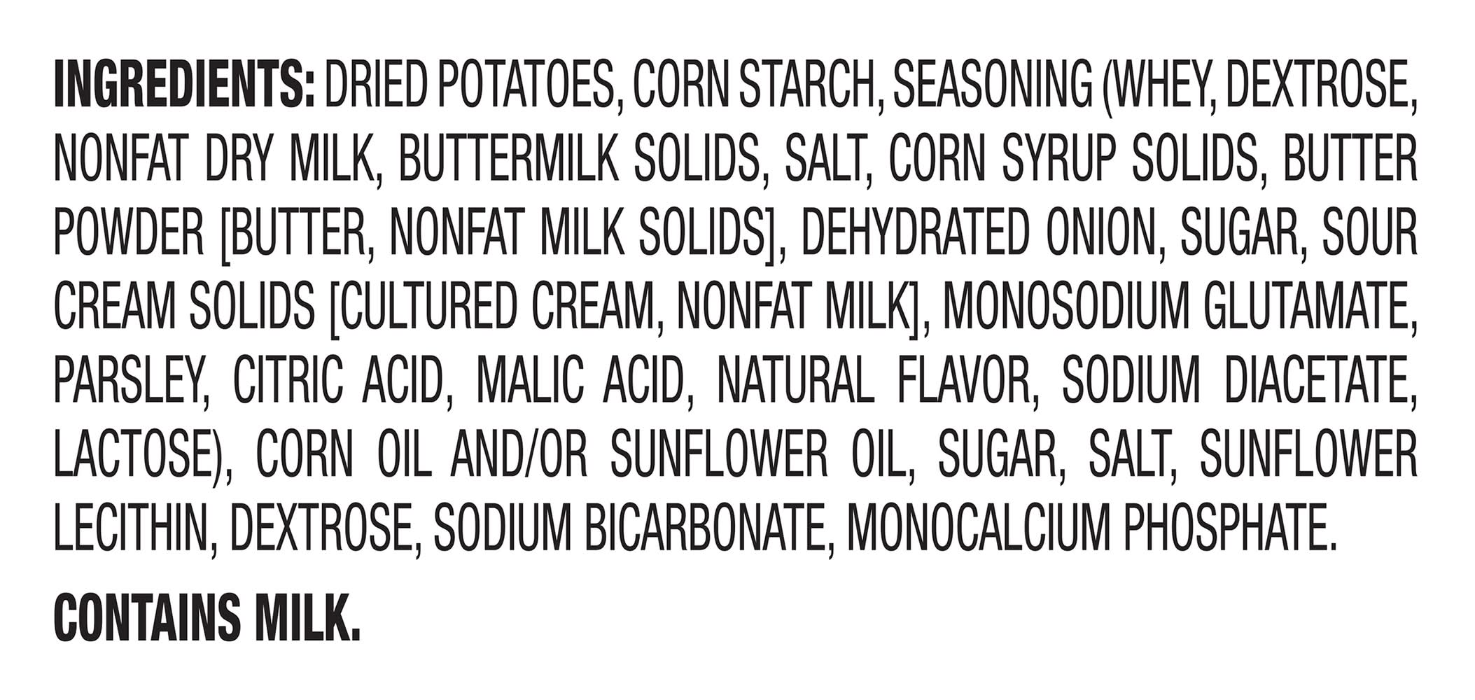 Ingredients: Dried Potatoes, Corn Starch, Seasoning (Whey, Dextrose, Nonfat Dry Milk, Buttermilk Solids, Salt, Corn Syrup Solids, Butter Ronder [Butter, Nonfat Milk Solids], Dehydrated Onion, Sugar, Sour Cream Solids [Cultured Cream, Nonfat Milk], Monosodium Glutamate, Parsley, Citric Acid, Malic Acid, Natural Flavor, Sodium Diacetate, Lactose), Corn Oil and/or Sunflower Oil, Sugar, Salt, Sunflower Lecithin, Dextrose, Sodium Bicarbonate, Monocalcium Phosphate Contains: Milk, Corn
