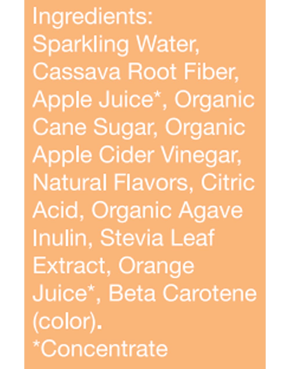 Ingredients: Sparkling Water, Cassava Root Fiber, Apple Juice*. Organic Cane Sugar, Organic Apple Cider Vinegar, Natural Flavors, Citric Acid, Organic Agave Inulin, Stevia Leaf Extract, Orange Juice* Beta Carotene (color), . *Concentrate