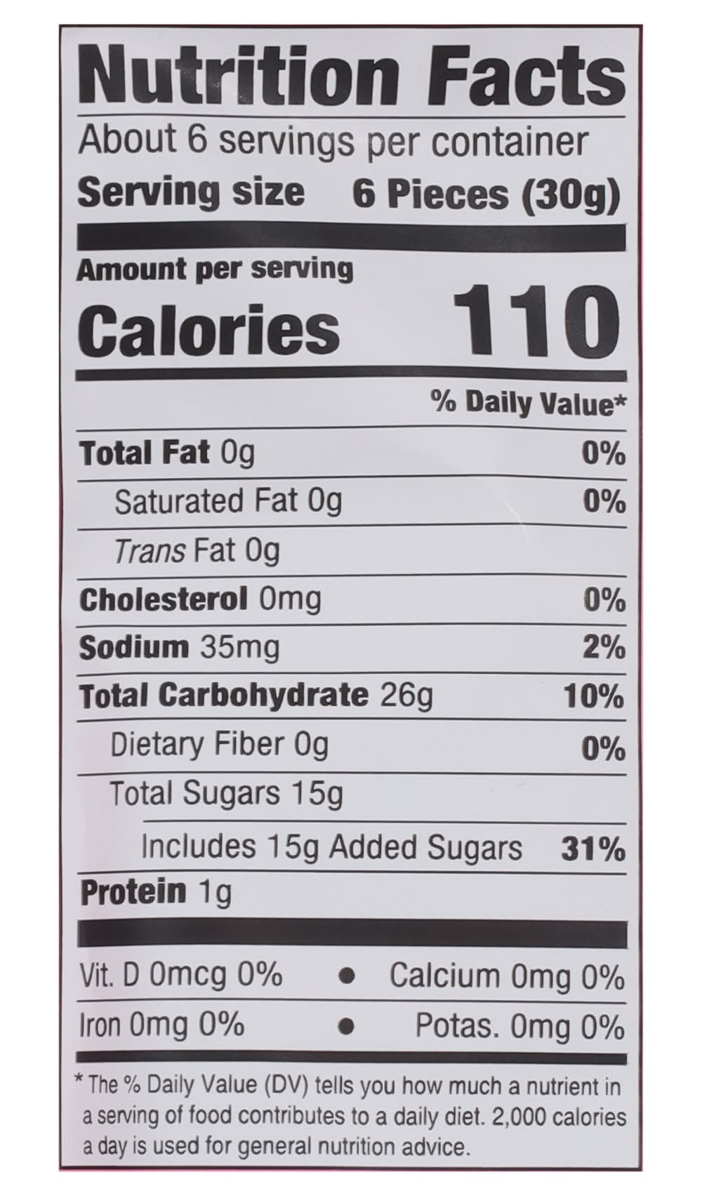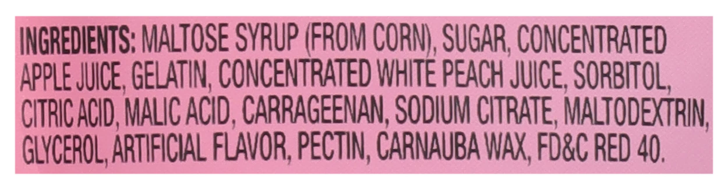 Ingredients: Maltose Syrup (from Corn), Sugar, Concentrated Apple Juice, Gelatin, Concentrated White Peach Juice, Sorbitol, Citric Acid, Malic Acid, Carrageenan, Sodium Citrate, Maltodextrin, Glycerol, Artificial Flavor, Pectin, Carnauba Wax, FD&C Red 40