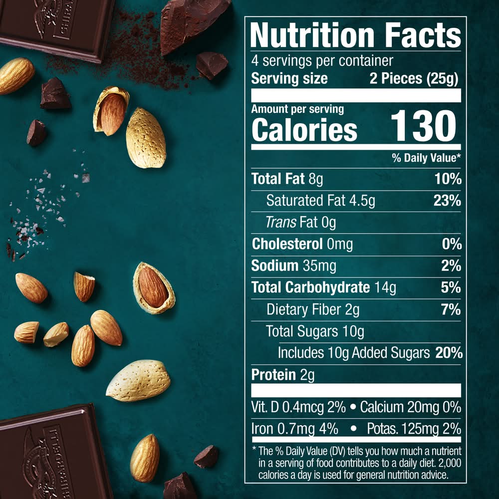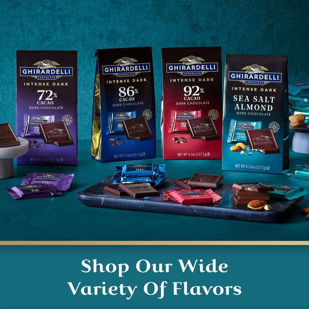 Each intensely delicious square of the Intense Dark Sea Salt Almond Chocolate Bar caters to your senses. Indulge in the rich chocolate intensity after dinner, or serve Intense Dark chocolate candy at your next gathering to create the ultimate moment of sheer delight for your guests. Savor the indulgent taste of the finest cacao beans skillfully blended to create intensely delicious dark chocolate with roasted almonds and sea salt for an irresistible combination of salty and sweet. These chocolate candy bars break apart into individual squares for easy portioning. Premium ingredients, including sustainably sourced cocoa beans used in exclusive blends, create a smooth, slow-melting dark chocolate bar. Explore rich, bold and intensely delicious dark chocolate. Experience rich, bold and intensely delicious dark chocolate, roasted almonds and sea salt for an irresistible combination of salty and sweet • Brand: Ghirardelli • kosher • Ghirardelli chocolate, San Leandro, CA 94578,