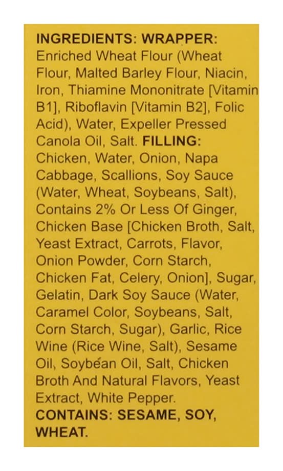 Ingredients: Wrapper: Enriched Wheat Flour (Wheat Flour, Malted Barley Flour, Niacin, Iron, Thiamine Mononitrate [Vitamin B1], Riboflavin [Vitamin B2], Folic Acid), Water, Expeller Pressed Canola Oil, Salt, Filling: Chicken, Water, Onion, Napa Cabbage, Scallions, Soy Sauce (Water, Wheat, Soybeans, Salt), Contains 2% or Less of Ginger, Chicken Base [Chicken Broth, Salt, Yeast Extract, Carrots, Flavor, Onion Powder, Corn Starch, Chicken Fat, Celery, Onion], Sugar, Gelatin, Dark Soy Sauce (Water, Caramel Color, Soybeans, Salt, Corn Starch, Sugar), Garlic, Rice Wine (Rice Wine, Salt), Sesame Oil, Soybean Oil, Salt, Chicken Broth and Natural Flavors, Yeast Extract, White Pepper Contains: Sesame, Soybeans, Wheat, Barley, Celery, Corn