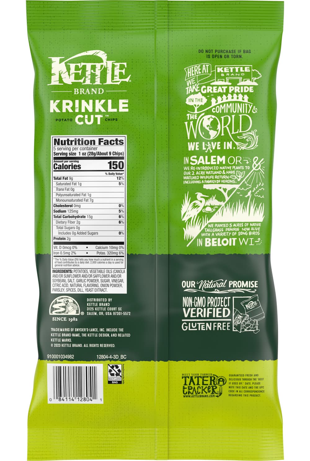 Kettle Brand Krinkle Cut Dill Pickle kettle chips are sliced thicker than our classic kettle chips for an extra crunch. And their deep ridges hold all the extreme seasoning they need. In this case, the perfect balance of tang, dill, onion, and garlic flavors. These chips are a must-try! On top of that, they follow Our Natural Promise to be Non-GMO and gluten free. So go ahead, experience the power of the crunch and the tangy flavor by eating them straight out of the bag. It takes pretty high standards to achieve the amazing taste of Kettle Brand chips. When you open a bag of Kettle Brand Krinkle Cut kettle chips, you know you’re getting incredible quality made with authentic recipes by real people who really care about what they do. This 5-ounce bag of kettle chips is perfect for sharing with friends, or just snacking on the couch. • Brand: Kettle brand • gluten-free • Number of servings: 5 • Packaging: Reusable