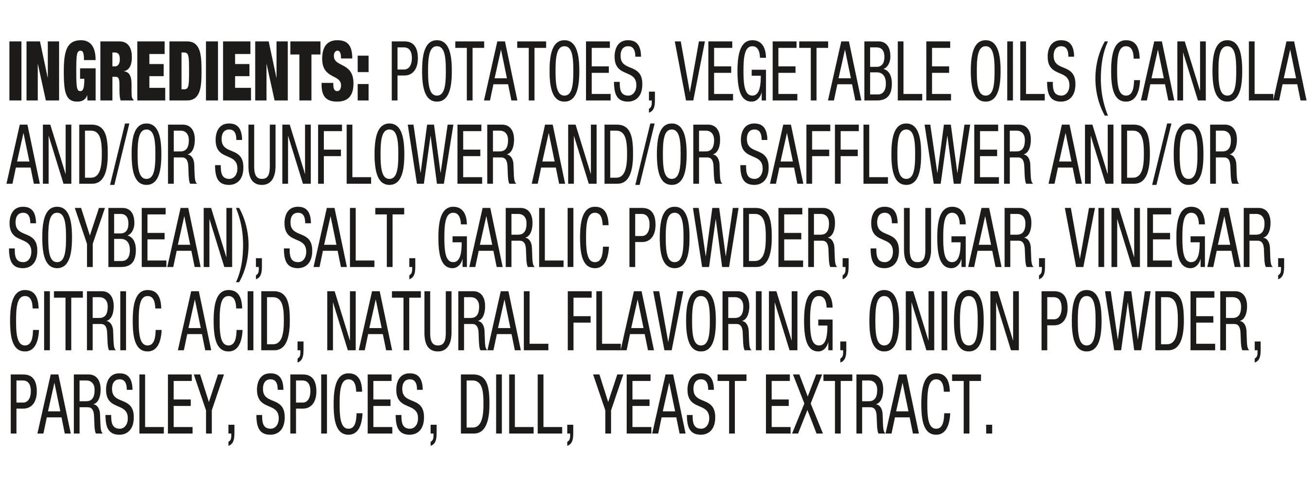 Ingredients: INGREDIENTS: POTATOES, VEGETABLE OILS (CANOLA AND/OR SUNFLOWER AND/OR SAFFLOWER AND/OR SOYBEAN), SALT, GARLIC POWDER, SUGAR, VINEGAR, CITRIC ACID, NATURAL FLAVORING, ONION POWDER, PARSLEY, SPICES, DILL, YEAST EXTRACT. Contains: 'Gluten Free From'