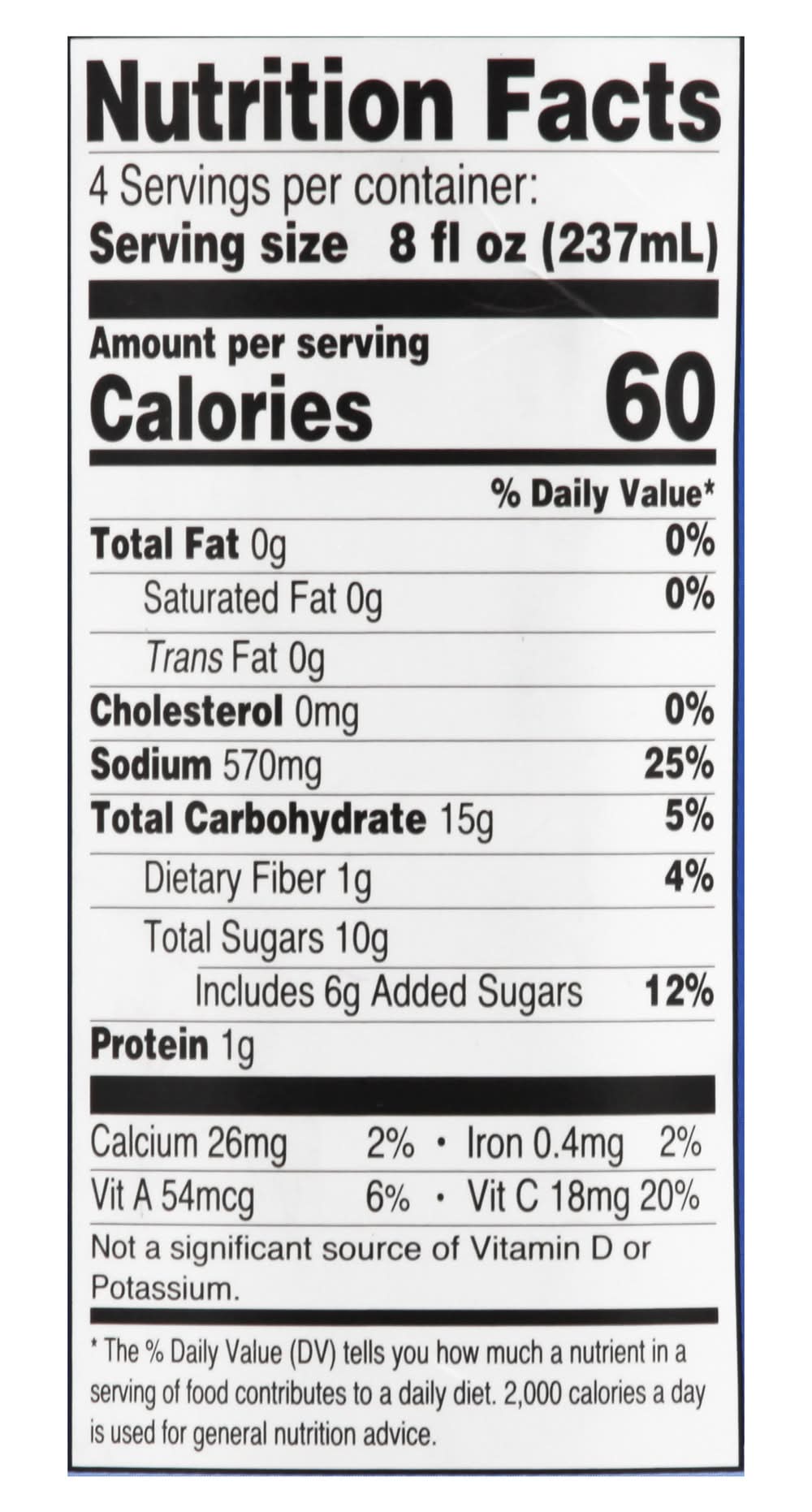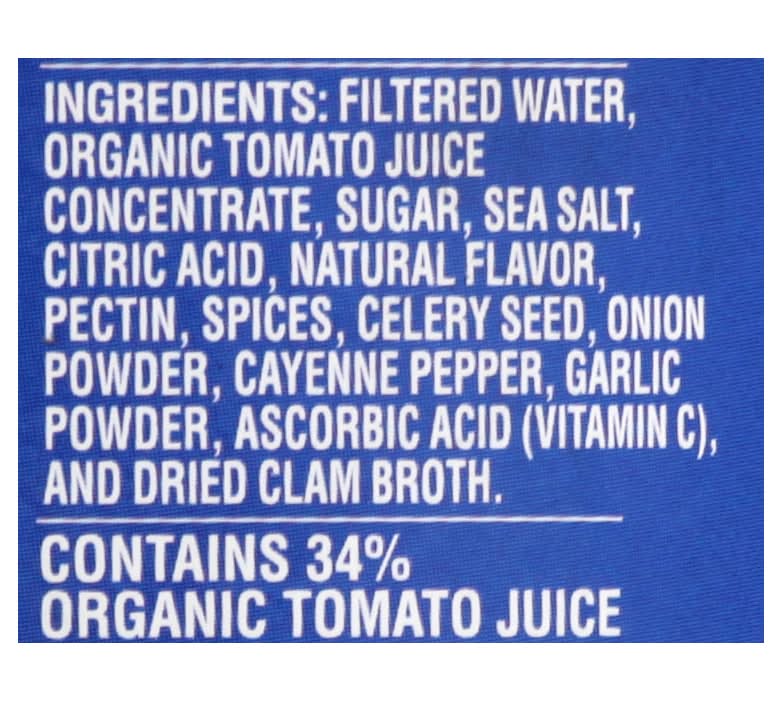 Ingredients: Filtered Water, Organic Tomato Juice Concentrate, Sugar, Sea Salt, Citric Acid, Natural Flavor, Pectin, Spices, Celery Seed, Onion Powder, Cayenne Pepper, Garlic Powder, Ascorbic Acid (Vitamin C), and Dried Clam Broth