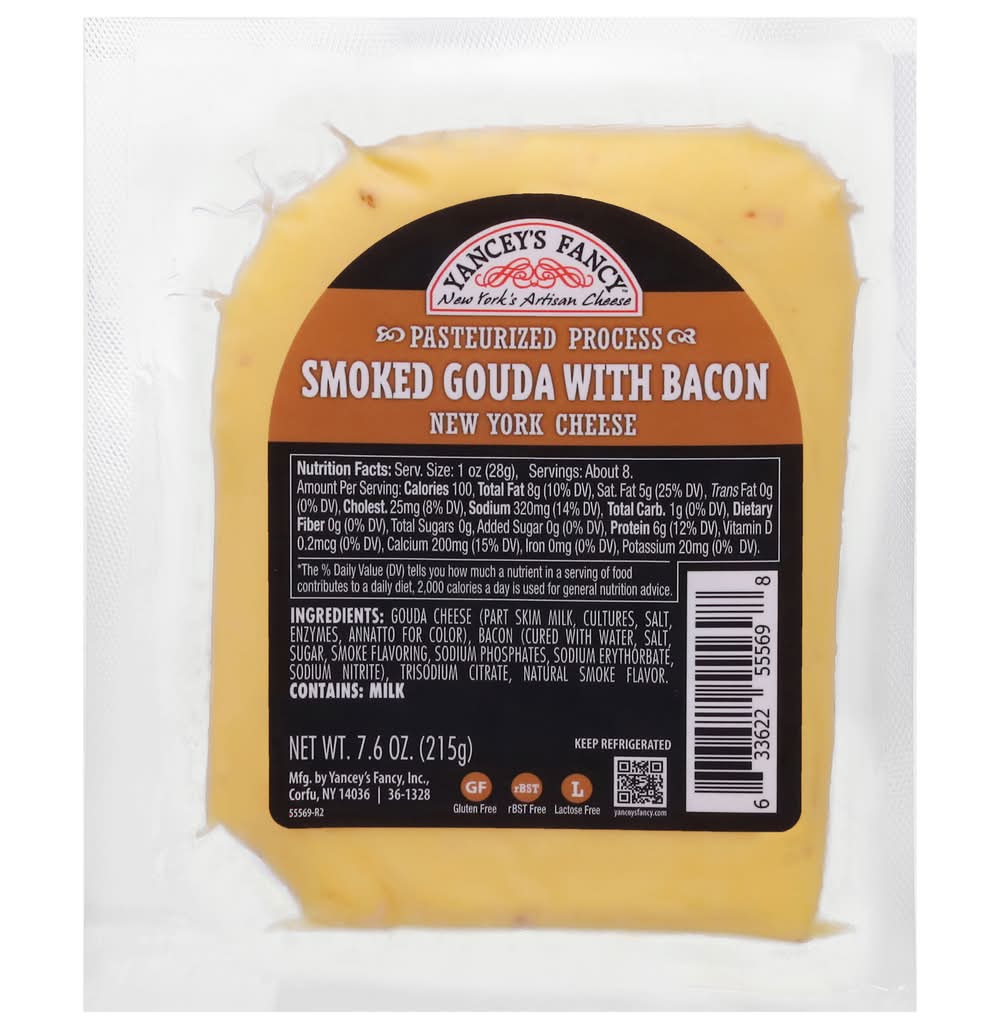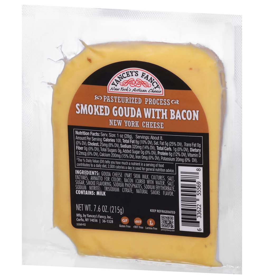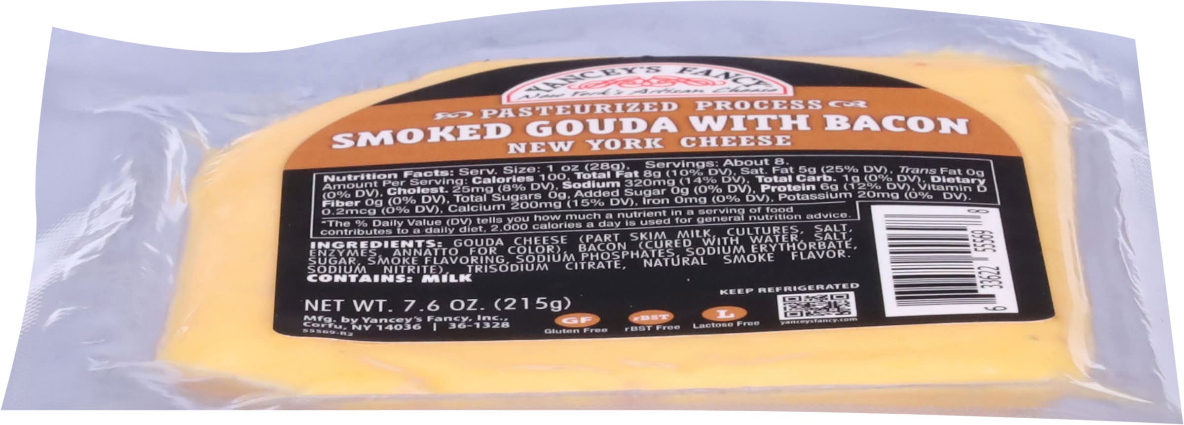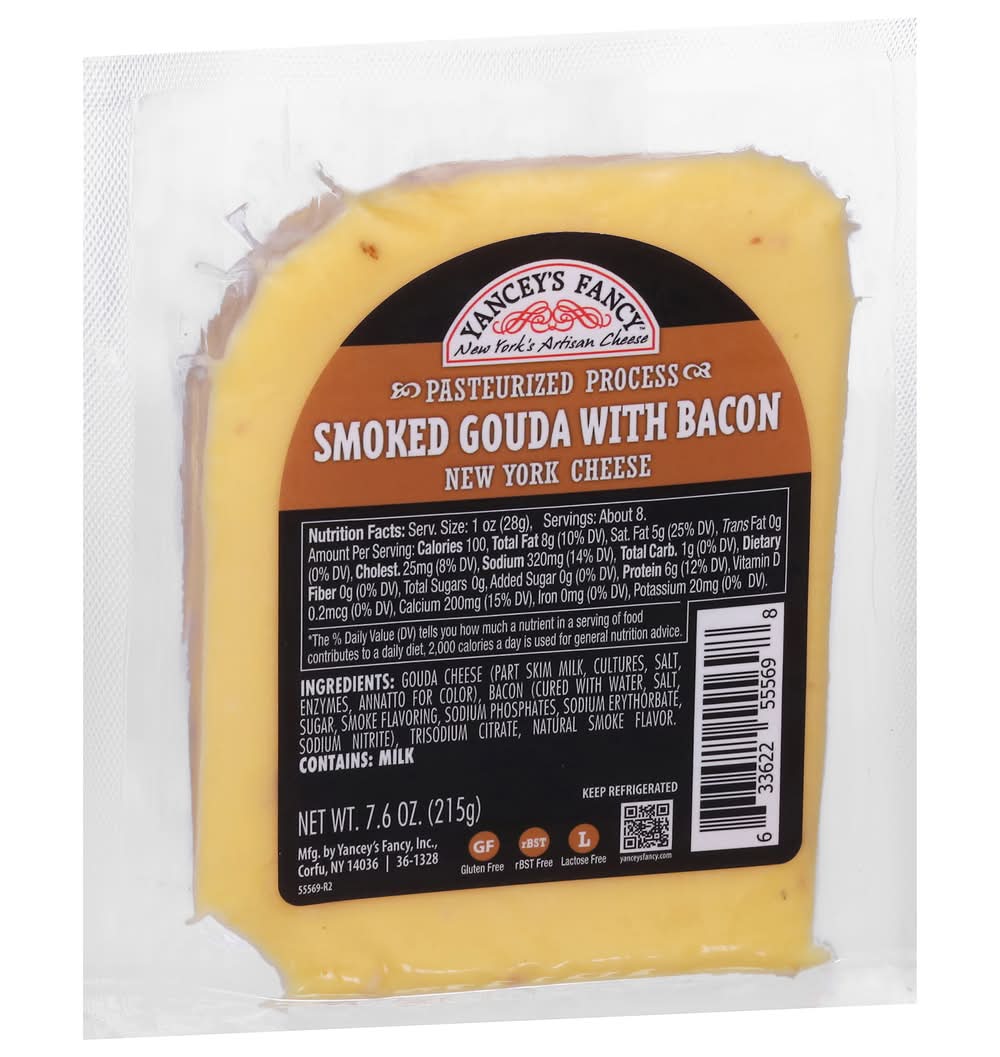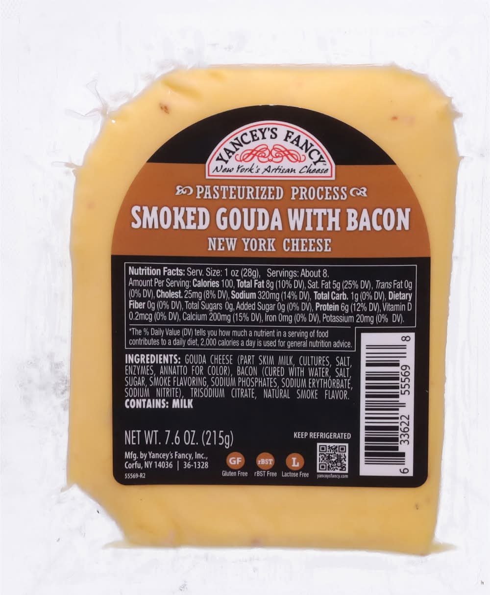 Cheese, Smoked Gouda with Bacon • Brand: Yancey's fancy • gluten-free, lactose-free • Yanceys Fancy, Corfu, NY 14036