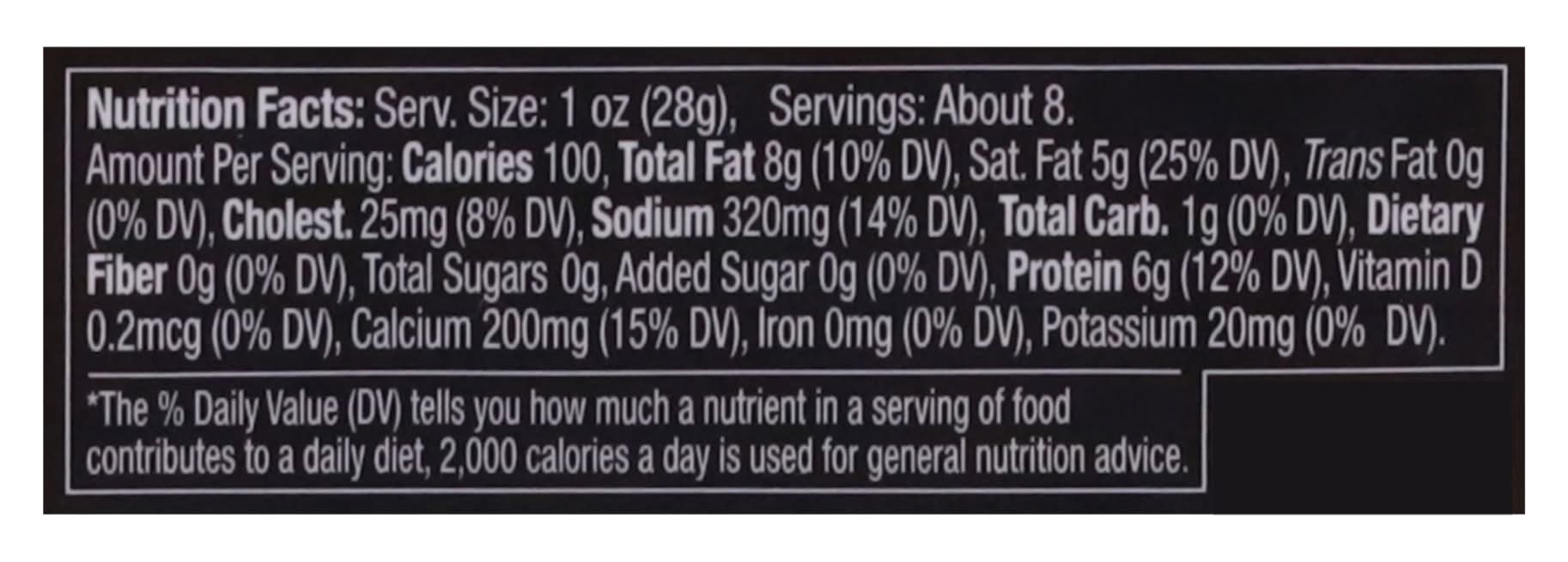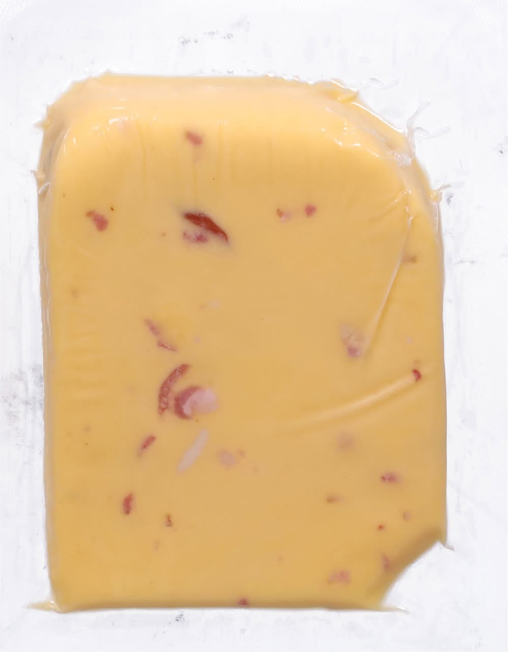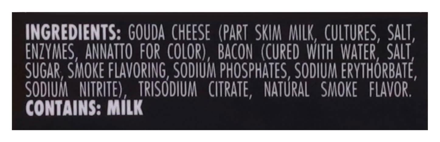 Ingredients: Gouda Cheese (Part Skim Milk, Cultures, Salt, Enzymes, Annatto for Color), Bacon (Cured with Water, Salt, Sugar, Smoke Flavoring, Sodium Phosphates, Sodium Erythorbate, Sodium Nitrite), Trisodium Citrate, Natural Smoke Flavor Contains: Milk
