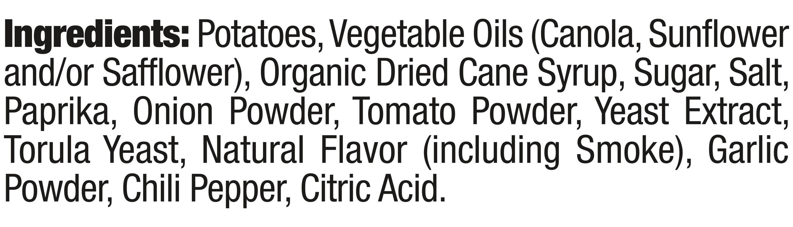 Ingredients: Potatoes Vegetable Oils (Canola Sunflower and/or Safflower) Organic Dried Cane Syrup Sugar Salt Paprika Onion Powder Tomato Powder Yeast Extract Torula Yeast Natural Flavor (Including Smoke) Garlic Powder Chili Pepper Citric Acid.