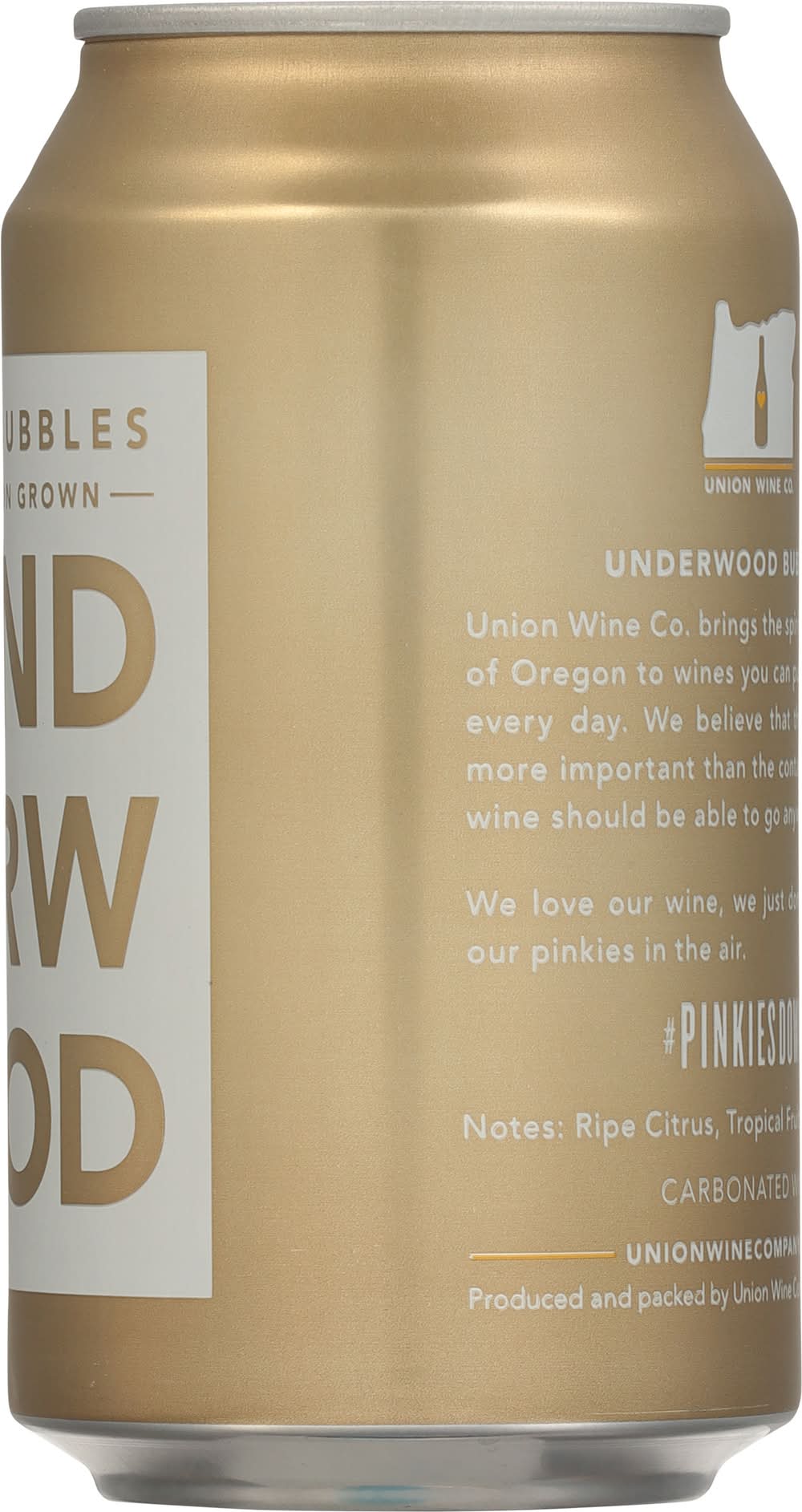 Vegan. Gluten free. Union Wine Co. brings the spirit and character of Oregon to wines you can put on your table every day. We believe that the contents are more important than the container; that good wine should be able to go anywhere. We love our wine, we just don't drink it with our pinkies in the air. Notes: Ripe citrus, tropical fruit, white flowers. 1% for the planet. Cans can be recycled infinitely. • Brand: Underwood • vegan, gluten-free • Alcohol by volume: 11% • Packaging: Reusable