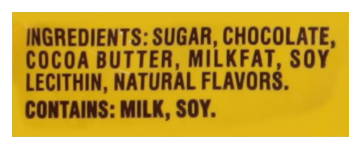 Ingredients: Sugar, Chocolate, Cocoa Butter, Milkfat Soy Lecithin Natural Flavors. Contains: Soybeans, Milk