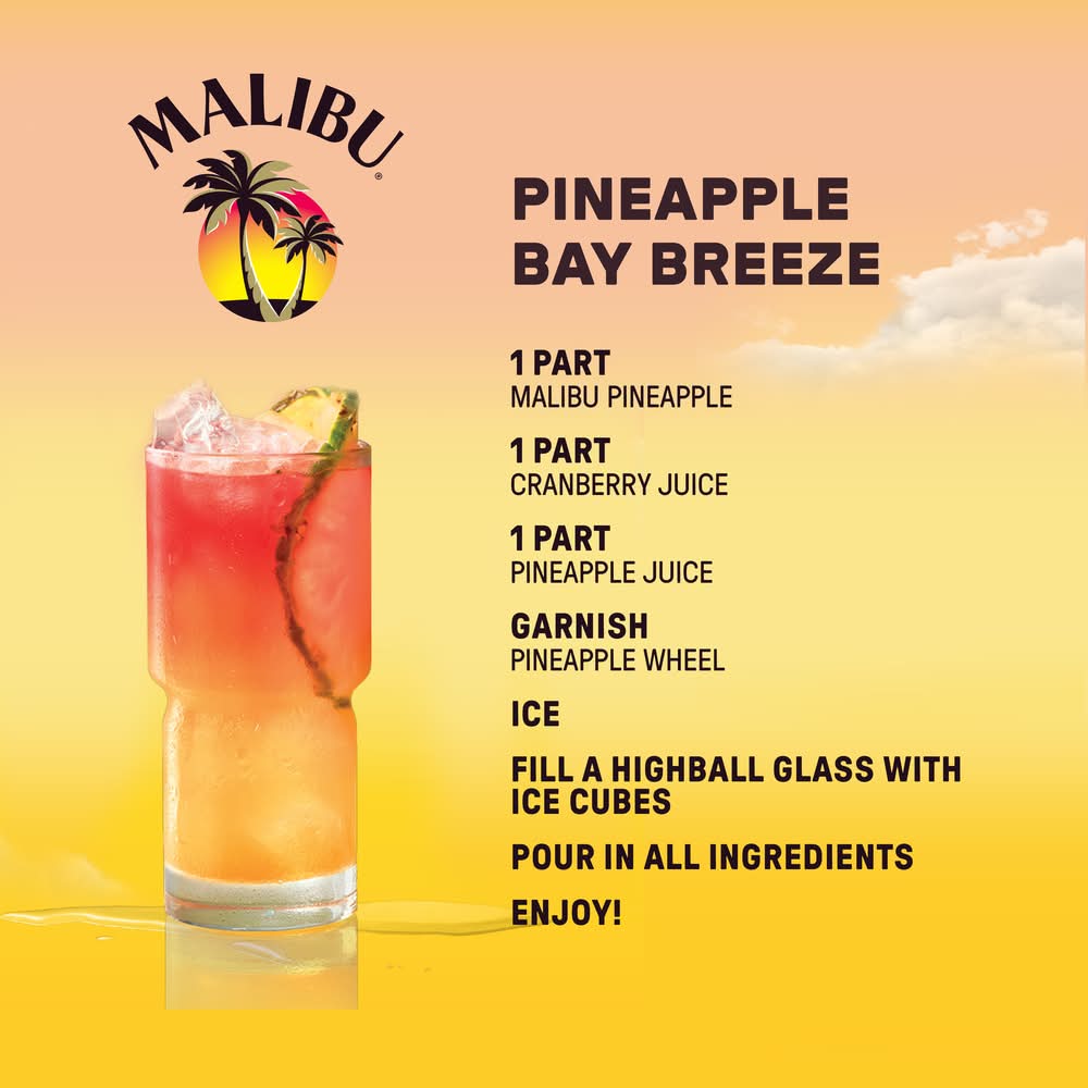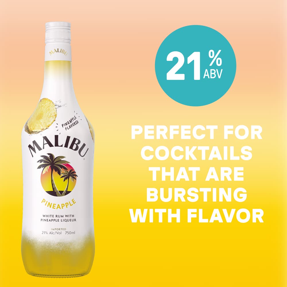 If your drink of choice is a piña colada, you will love the taste of Malibu , a delicious product in the Malibu lineup. This spirit combines sweet flavor with delicious Caribbean rum for a spirit that goes down smoothly. • Brand: Malibu • Flavor: Pineapple • Alcohol by volume: 21% • Pernod Ricard, New york, Ny