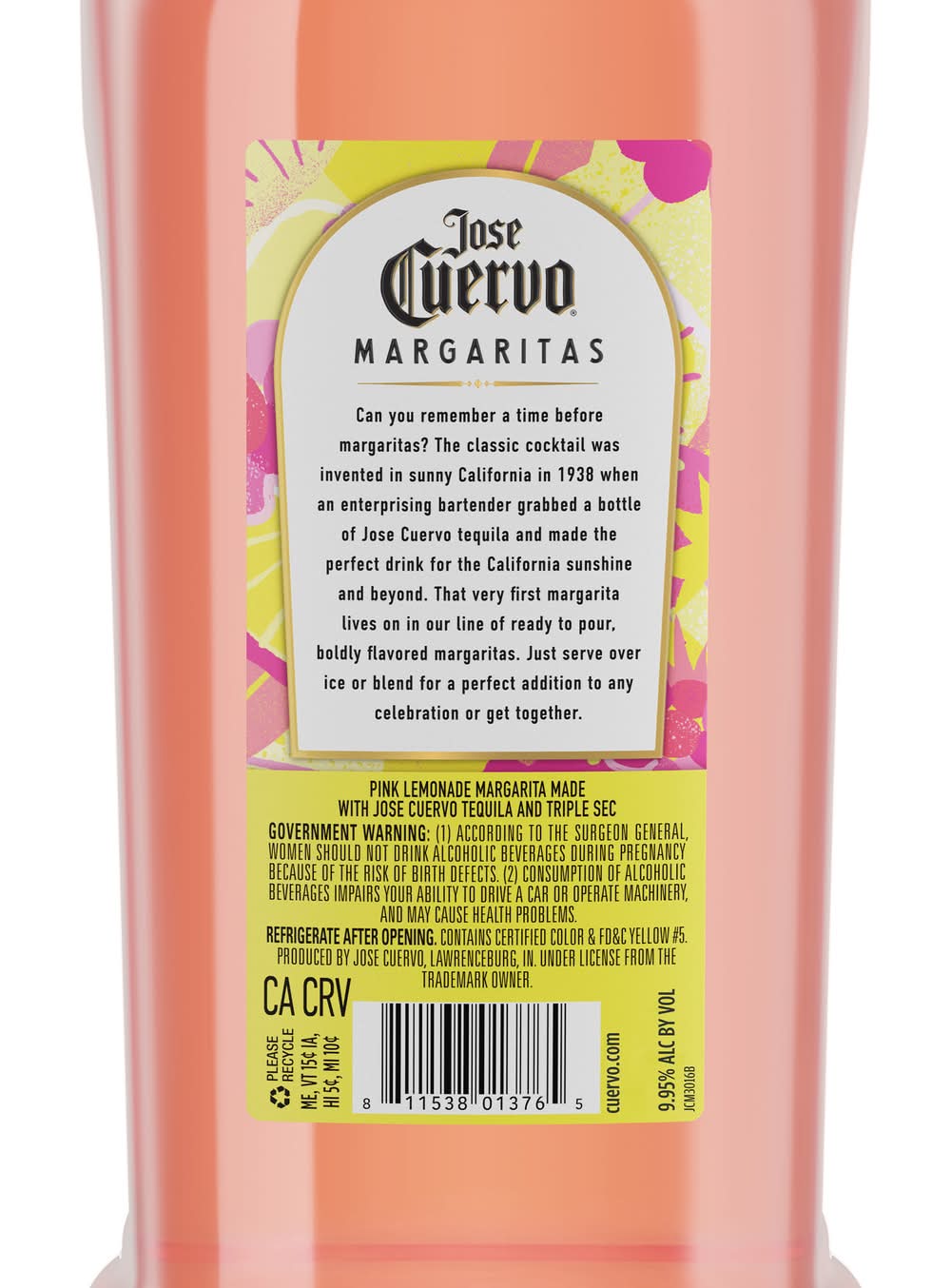 Ready-to-serve margaritas come in many classic, fruity and fun flavors made exclusively with Jose Cuervo tequila. Jose Cuervo Authentic Margaritas offers the convenience of a one-step margarita with plenty of ways to enjoy it: • Pour over Ice • Blend • Make it a spritz & add sparkling water • Garnish with a lemon slice or pink dragon fruit • Sugar rim recommended. • Flavor: Pink lemonade • Alcohol by volume: 9.95% • Packaging: Reusable