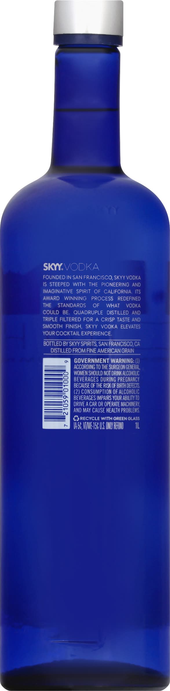 Founded in San Francisco, Skyy Vodka is steeped with the pioneering and imaginative spirit of California. Its award winning process redefined the standards of what vodka could be. Quadruple distilled and triple filtered for a crisp taste and smooth finish, Skyy Vodka Elevates your cocktail experience. Distilled from fine American grain. • Alcohol by volume: 40% • Packaging: Reusable