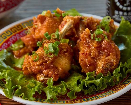 Four pieces. Fried chicken wings with a spicy ginger sauce.