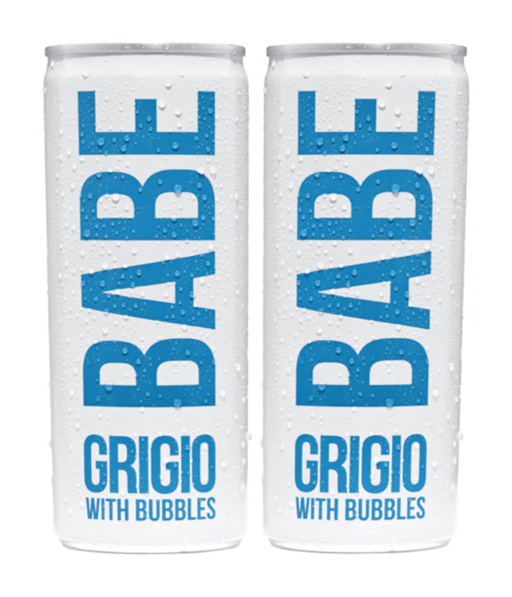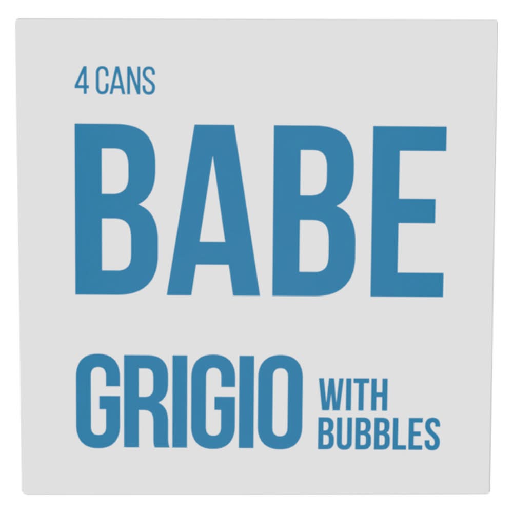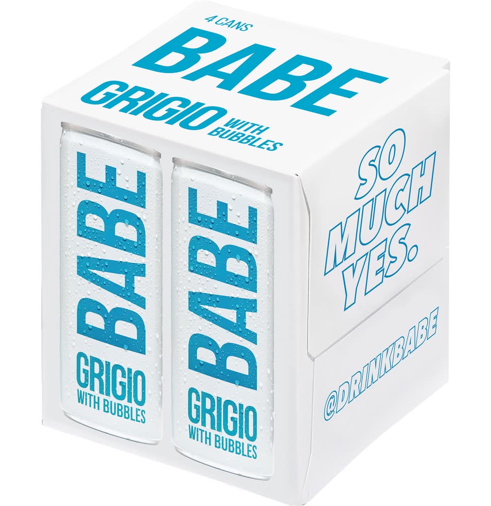 BABE is the cute, delicious, take-anywhere wine in a can that pairs well with literally everything. Three of these Babe cans of delicious bubbly Pinot Grigio are equivalent to drinking one bottle of wine. You're welcome. Drink it with your friends, or drink it without them. Babe Grigio with Bubbles, Aluminum Cans, Please recycle. • Brand: Babé • Pack size: 4 • Alcohol by volume: 12% • Packaging: Reusable