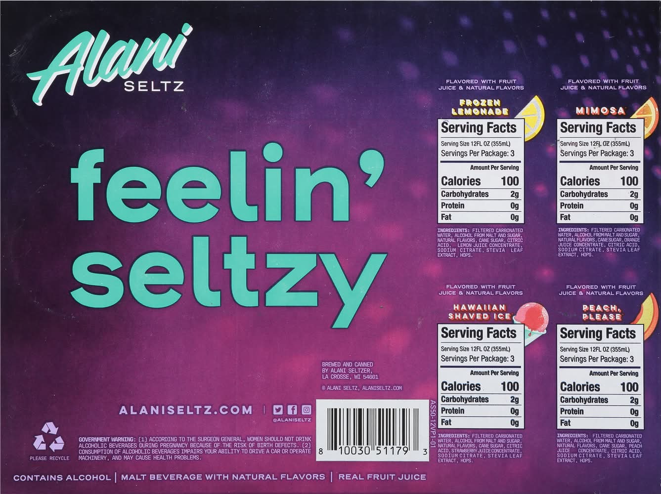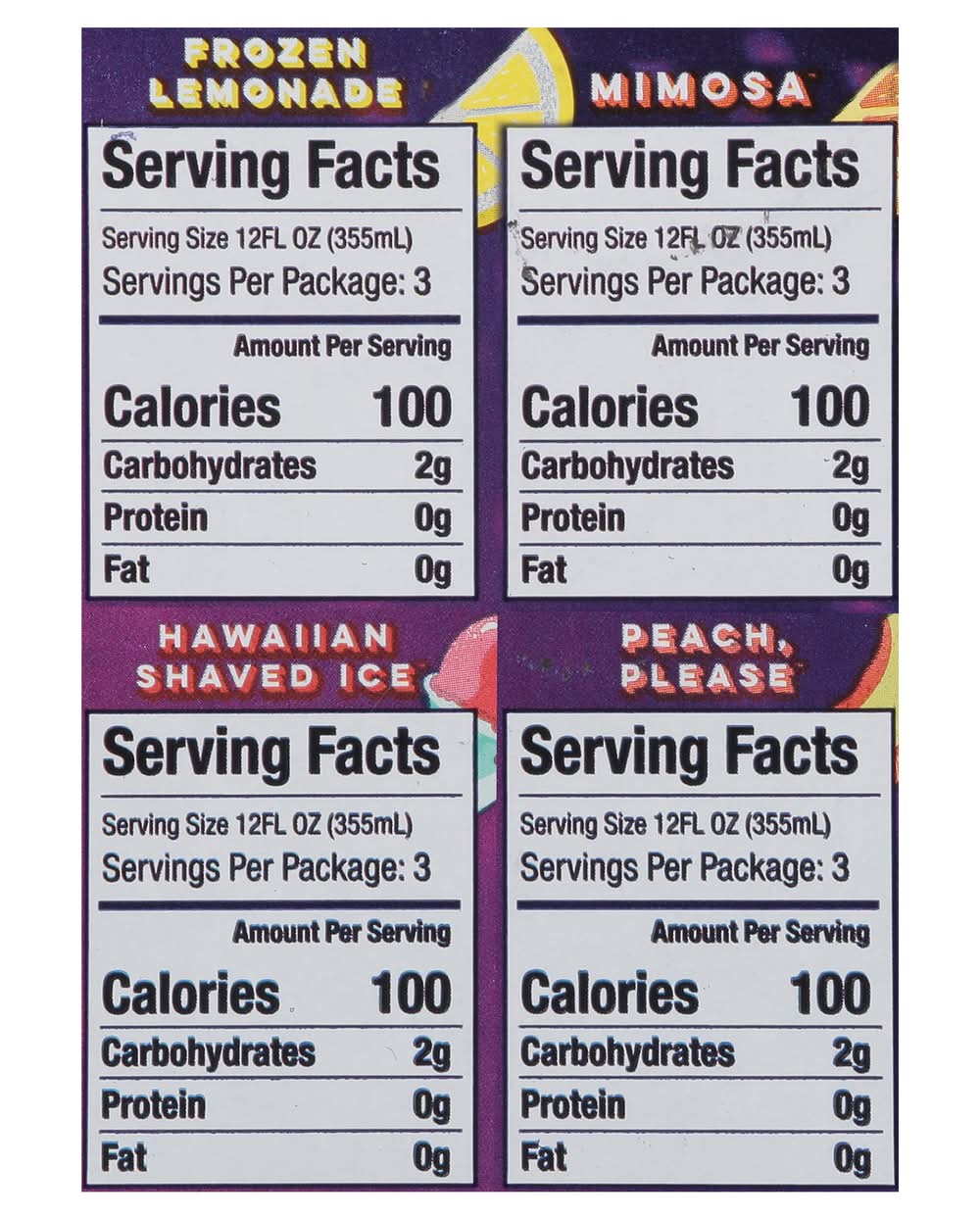 Seltzer, Hawaiian Shaved Ice/Mimosa/Peach Please/Frozen Lemonade, Spiked, Party Pack • Pack size: 12 • Alcohol by volume: 5%