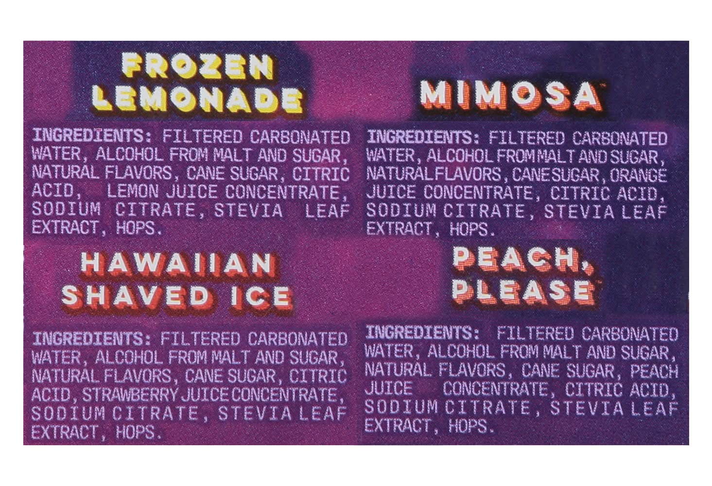Ingredients: Mimosa: Filtered Carbonated Water, Alcohol from Malt and Sugar, Natural Flavors, Cane Sugar, Orange Juice Concentrate, Citric Acid, Sodium Citrate, Stevia Leaf Extract, Hops. Peach, Please: Filtered Carbonated Water, Alcohol from Malt and Sugar, Natural Flavors, Cane Sugar, Peach Juice Concentrate, Citric Acid, Sodium Citrate, Stevia Leaf Extract, Hops. Frozen Lemonade: Filtered Carbonated Water, Alcohol from Malt and Sugar, Natural Flavors, Cane Sugar, Citric Acid, Lemon Juice Concentrate, Sodium Citrate, Stevia Leaf Extract, Hops. Hawallan Shaved Ice: Filtered Carbonated Water, Alcohol from Malt and Sugar, Natural Flavors, Cane Sugar, Citric Acid, Strawberry Juice Concentrate, Sodium Citrate, Stevia Leaf Extract, Hops.