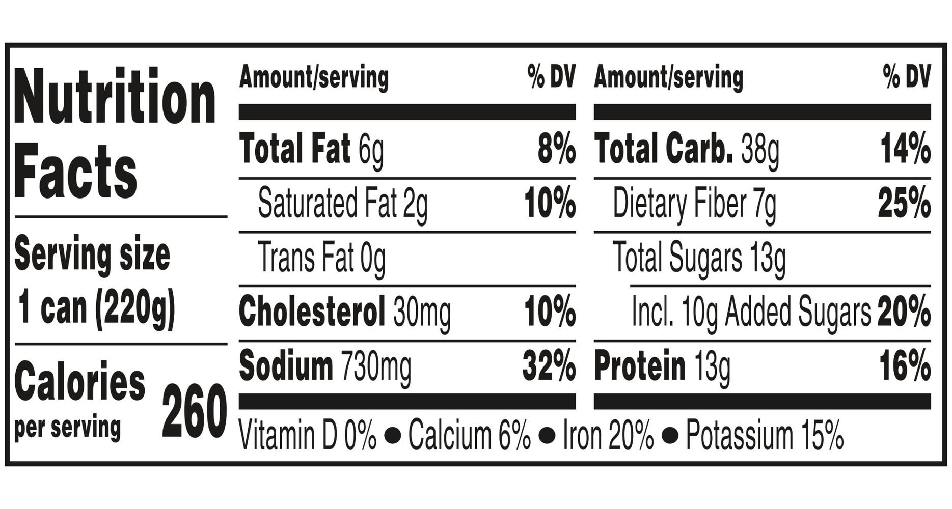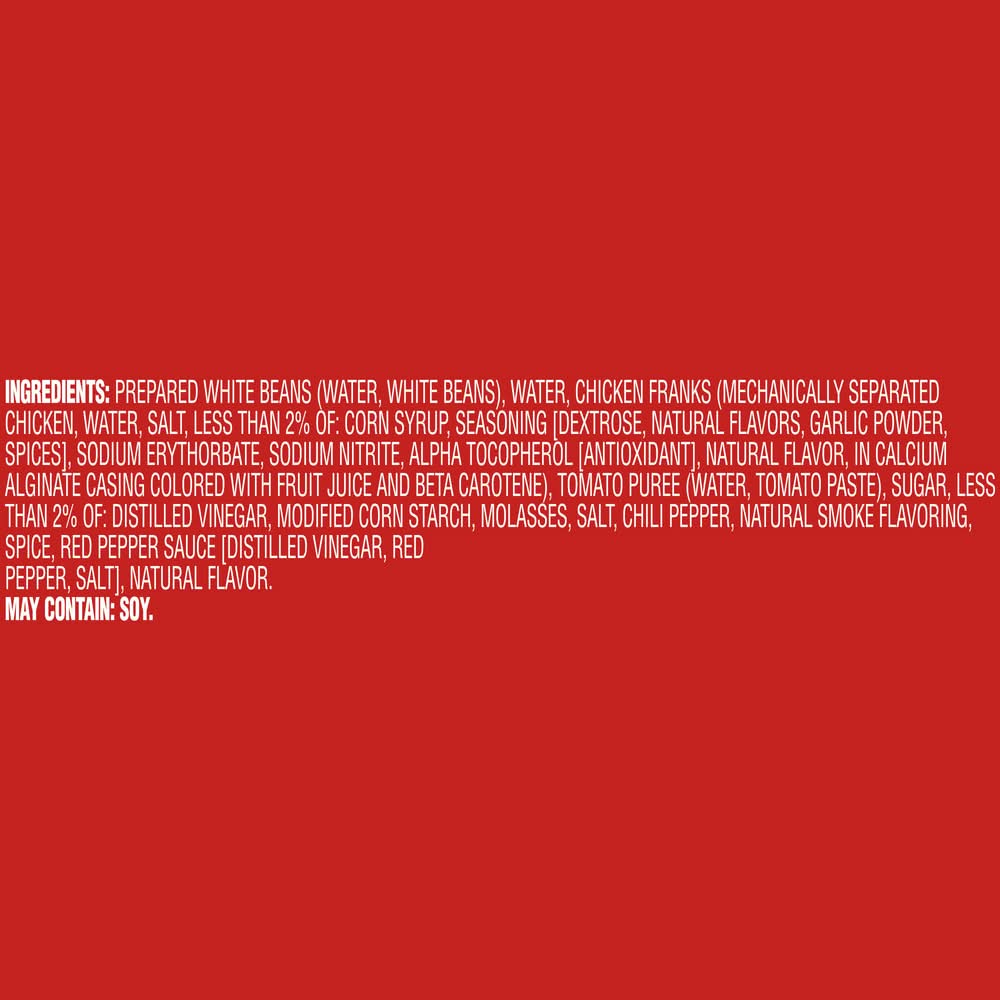 Ingredients: Prepared White Beans (Water, White Beans), Water, Chicken Franks (Mechanically Separated Chicken, Water, Salt, Corn Syrup, Dextrose, Sodium Phosphate, Natural Flavorings, Paprika, Sodium Erythorbate, Sodium Nitrite, Extractives of Paprika), Tomato Puree (Water, Tomato Paste), Sugar, Less than 2% of: Distilled Vinegar, Modified Corn Starch, Molasses, Salt, Chili Pepper, Natural Smoke Flavor, Spice, Red Pepper Sauce (Distilled Vinegar, Red Pepper, Salt), Natural Flavors, Soy Lecithin. CONTAINS: SOY. Contains: Mustard (Canada and EU), Soy