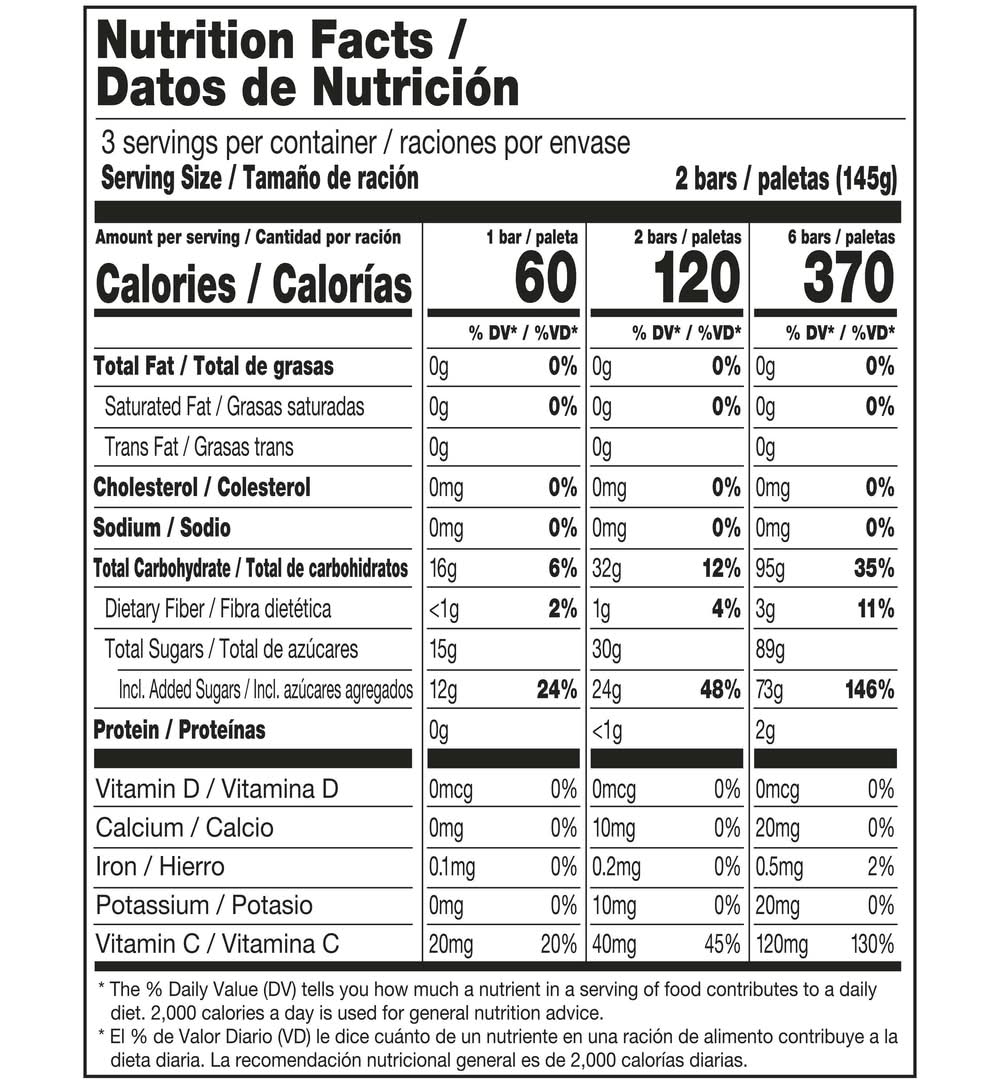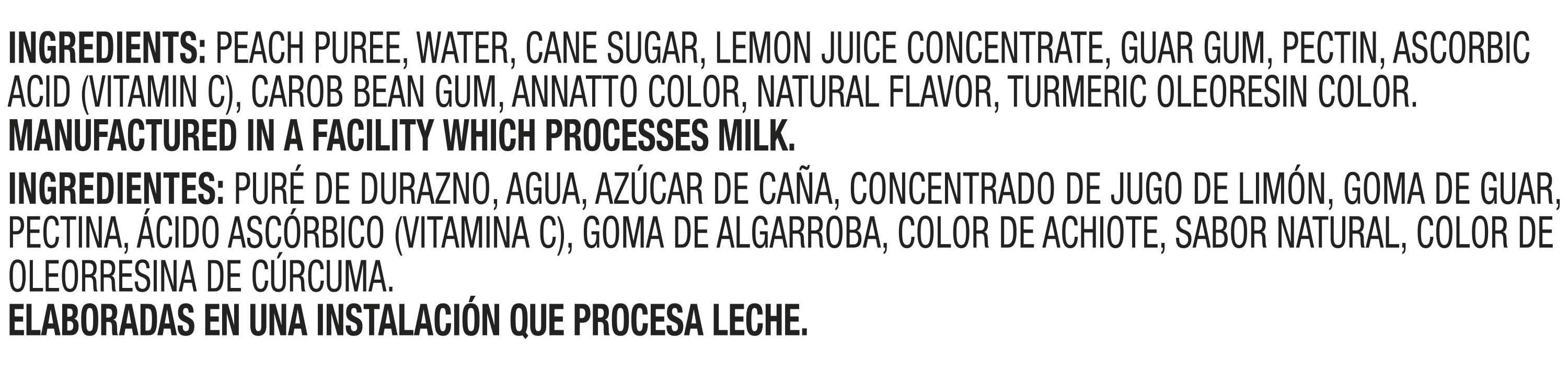 Ingredients: PEACH PUREE, WATER, CANE SUGAR, GUAR GUM, PECTIN, LEMON JUICE FROM CONCENTRATE (WATER, LEMON JUICE CONCENTRATE), ASCORBIC ACID (VITAMIN C), CAROB BEAN GUM, ANNATTO COLOR, NATURAL FLAVOR, TURMERIC OLEORESIN COLOR.