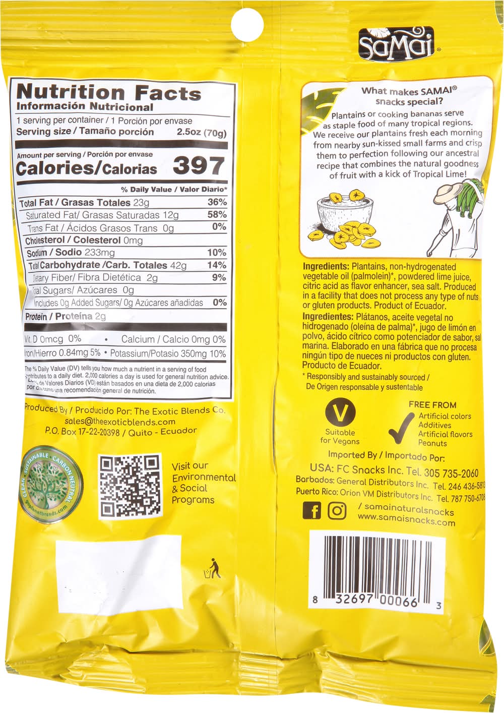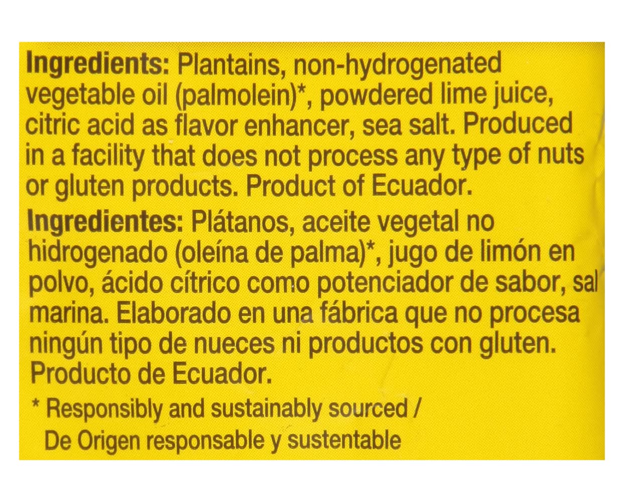 Ingredients: Plantains, Non-Hydrogenated Vegetables Oil (Palmolein) (Responsibly and Sustainably Sourced), Powdered Lime Juice, Citric Acid as Flavor Enhancer, Sea Salt