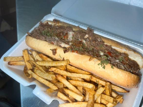 Philly Cheesesteak w/Grilled Onions, Grilled Bell Peppers, Mayo, American Cheese, and Country Sauce. Comes with a side of Roc City Macaroni Salad or Seasoned French Fries