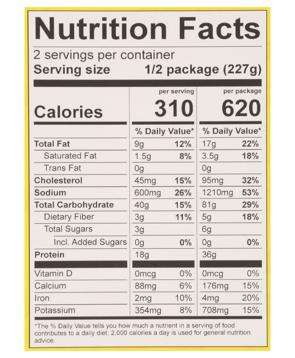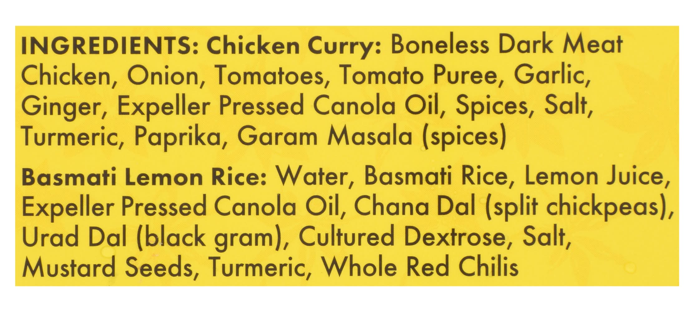 Ingredients: Chicken Curry: Boneless Dark Meat Chicken, Onion, Tomatoes, Tomato Puree, Garlic, Ginger, Expeller Pressed Canola Oil, Spices, Salt, Turmeric, Paprika, Garam Masala (Spices). Basmati Lemon Rice: Water, Basmati Rice, Lemon Juice, Expeller Pressed Canola Oil, Chana Dal (Split Chickpeas), Urad Dal (Black Gram), Cultured Dextrose, Salt, Mustard Seeds, Turmeric, Whole Red Chilis