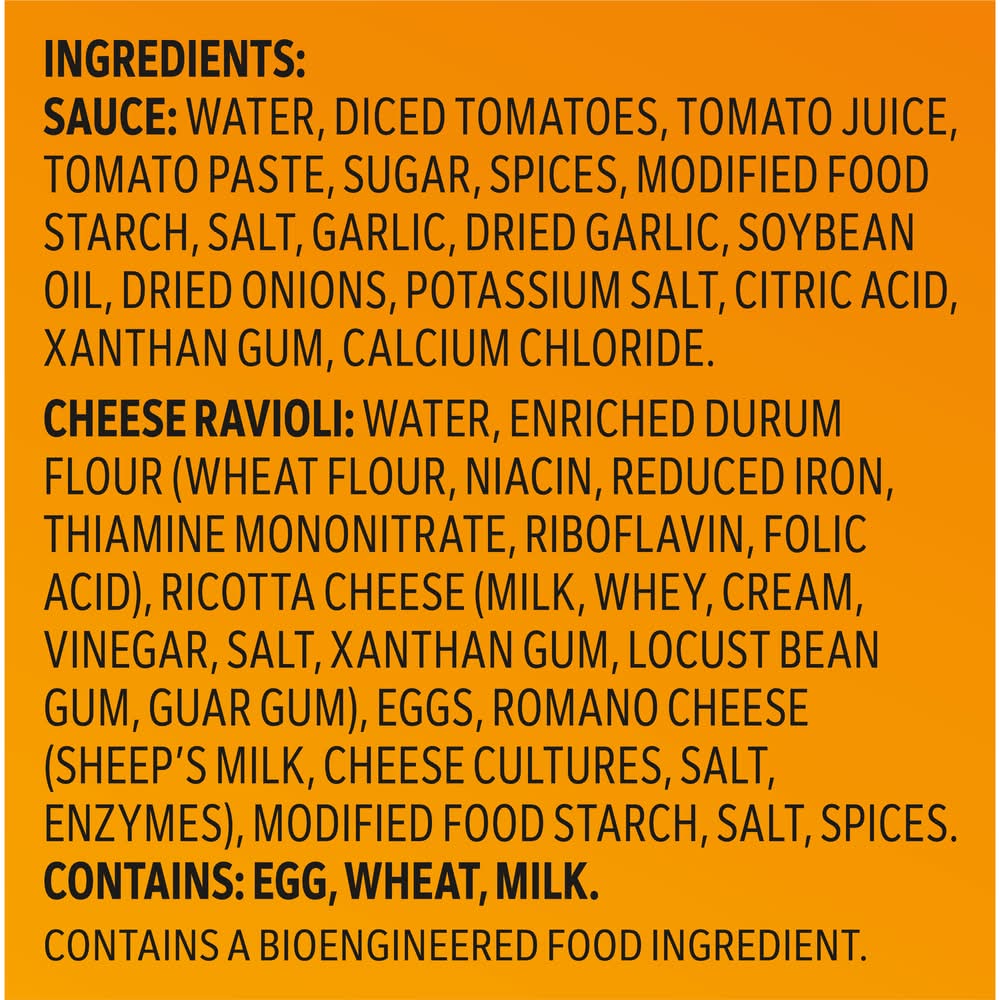 Ingredients: SAUCE: WATER, DICED TOMATOES, TOMATO JUICE, TOMATO PASTE, SUGAR, SPICES, MODIFIED FOOD STARCH, SALT, GARLIC, DRIED GARLIC, SOYBEAN OIL, DRIED ONIONS, POTASSIUM SALT, CITRIC ACID, XANTHAN GUM, CALCIUM CHLORIDE. CHEESE RAVIOLI: WATER, ENRICHED DURUM FLOUR (WHEAT FLOUR, NIACIN, REDUCED IRON, THIAMINE MONONITRATE, RIBOFLAVIN, FOLIC ACID), RICOTTA CHEESE (MILK, WHEY, CREAM, VINEGAR, SALT, XANTHAN GUM, LOCUST BEAN GUM, GUAR GUM), EGGS, ROMANO CHEESE (SHEEP'S MILK, CHEESE CULTURES, SALT, ENZYMES), MODIFIED FOOD STARCH, SALT, SPICES. Contains: Egg, Wheat, Milk