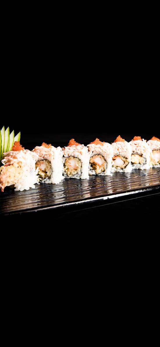 Shrimp tempura, cucumber maki, topped with crabmeat salad, tobiko, chef special sauce.