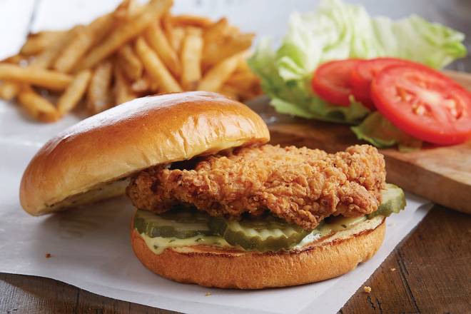Crispy fried chicken | honey mustard | lettuce | tomatoes | dill pickles | toasted parker house bun | side of BJ’s signature coleslaw | served with fries