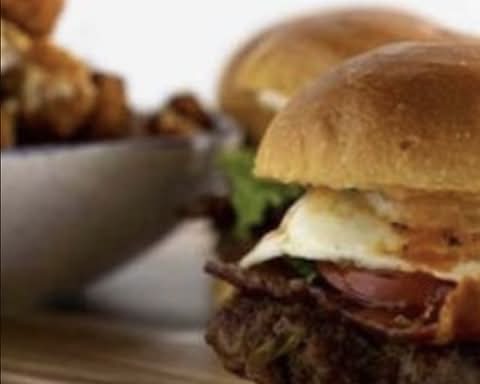 All-natural beef patty, white cheddar, mayo/mustard, organic fried egg, onion rings, caramelized red peppers