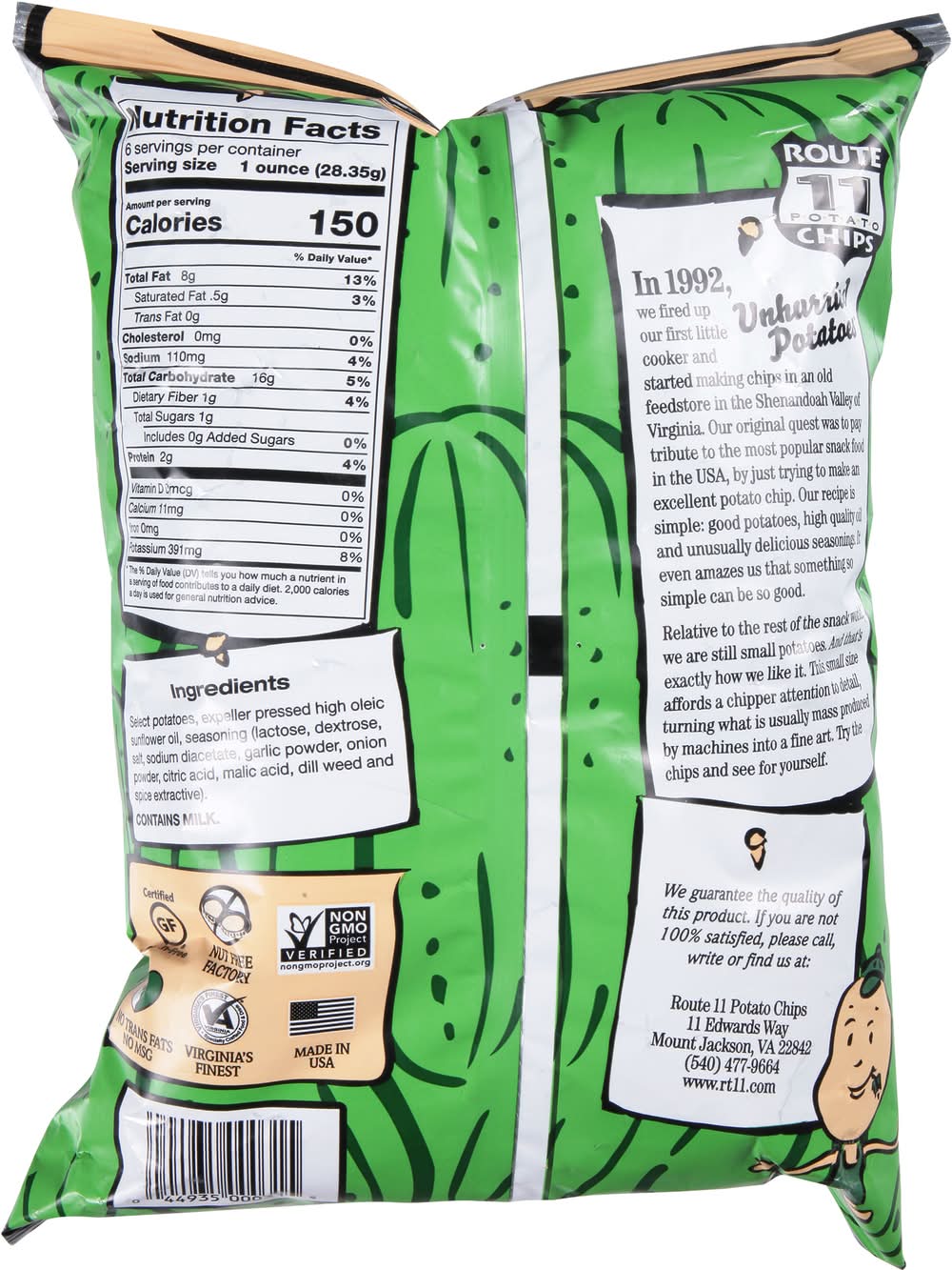 Potato Chips, Dill Pickle • Number of servings: 6 • Route 11 Potato Chips, Mount Jackson, VA, 22842, Ph: 540-477-9664