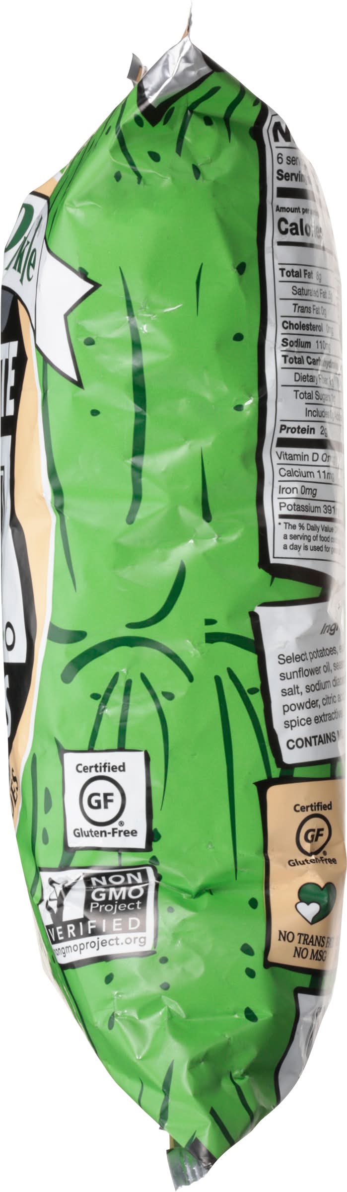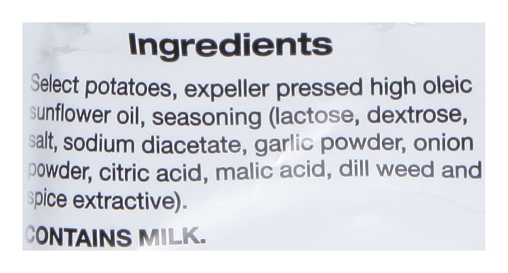 Ingredients: Select Potatoes, Expeller Pressed High Oleic Sunflower Oil, Seasoning (Lactose, Dextrose, Salt, Sodium Diacetate, Garlic Powder, Onion Powder, Citric Acid, Malic Acid, Dill Weed and Spice Extractive) Contains: Milk