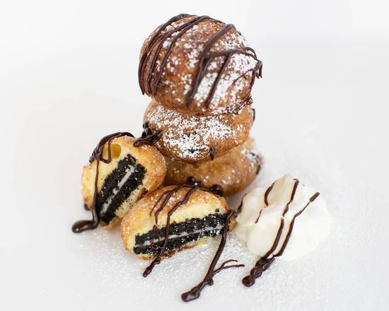 Oreos, powdered sugar, and Ghirardelli chocolate syrup.