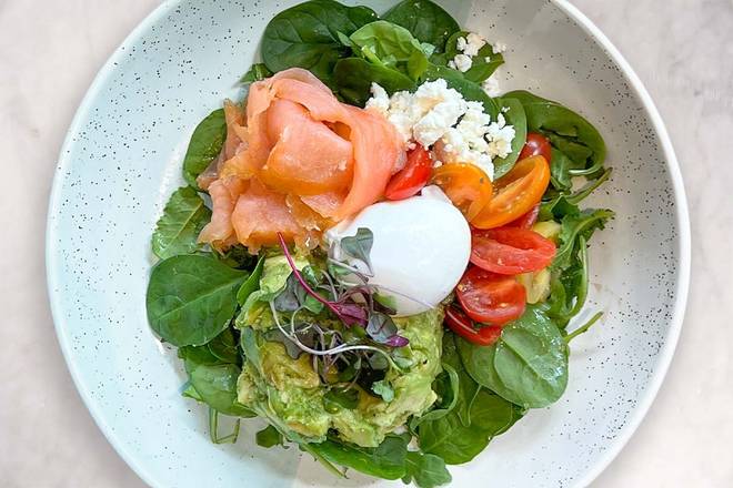 Smoked salmon, avocado, a hard-boiled egg on a bed of spinach & arugula mix, with feta, cherry tomatoes with lemon vinaigrette dressing