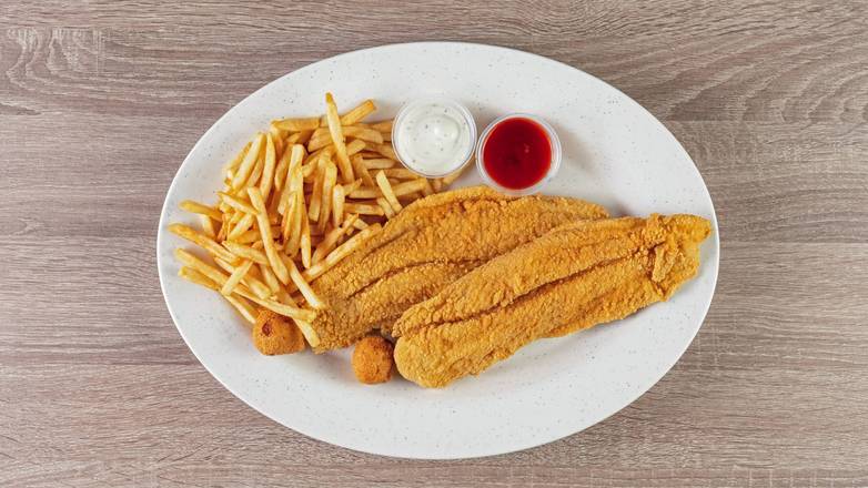 Tender catfish fillets served with crispy fries.