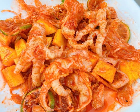 These tender, chewy boneless chicken claws are slow-cooked to tender perfection and tossed in a house-made hot and sour sauce, bursting with chili heat and citrusy lemon. Lemongrass adds a fresh herbal kick, while juicy mango slices bring a touch of sweetness to balance the bold flavors.