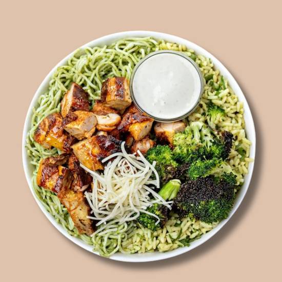 Coconut Yellow Rice, Pesto Noodles, Garlic Broccoli, Simply Grilled Chicken, Parmesan Cheese, and Creamy Garlic and Herb Sauce